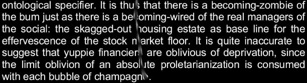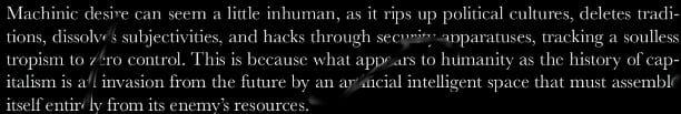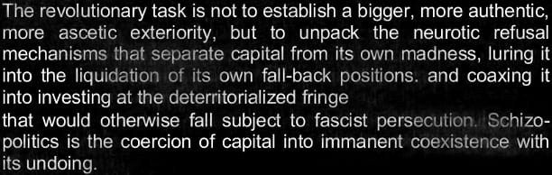 a festive mash-up, featuring William Gaddis IN HIS INIMITABLE PREPOSTEROUS STYLE, a book I doubt I’ll be reading much more of, Nick Land “making it with death,” like, inverted, whom I will, despite myself, be reading more of, to find out where it all tend