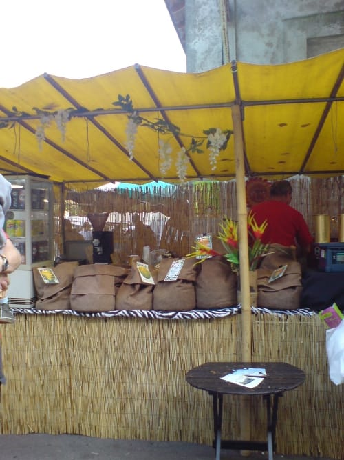 We weren’t. Back to the funny cafe-stall, where the owner might have been Dutch, resembling a certain cafe proprietor from the old days, a lackadaisical hippy, with his young female sidekick, dub, rather than pouring out or pounding, crackling, seeping out, and M., let us call him that, running between one-station machines, splitting each shot, unevenly, as we discovered, not exactly lost or dithering, but acting in an odd sort of counterpoint to actual demand, while uppity dowagers demanded to be served, whether they would get their coffee brought to them, or ought to wait, waving money, non-plussed by the distracted M. charging up machines, the full cups saved by young female sidekick, doled out, regardless of place in line to whomever might have ordered and claimed the shot. M. sending ice fragments flying as he got a batch of chocolate frappe going, making far too much each time, saved each time by sidekick. It all seemed very familiar. Except that here the service was even more inept than with even the most out-of-it hippy in NZ.