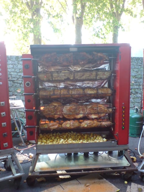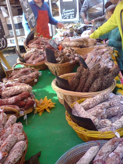 At this stall: sausages, pates, pressed meats, jellied meats, brawns, terrines, every variety you could imagine. And degustation plates out with slices and cubes of what was on offer. Blood sausage – which they were wide-eyed at us choosing – to pate-en-croute. Too too good. Duck sausages. All the sausages real, in intestines, hand-tied, chewily knotted. Mixtures of meats. Gibblety bits mingled with parts you’ve never heard of and distinctions between regional meats, beef from Limousin, or …, sharply distinguished tastes. Brawns and. More. The black pudding is called a queen here. We bought only the meagre amount that we would eat for breakfast. Shamefully. I wanted to apologise for taking so little when so much was on offer. I really said, We will be back. When we’ve eaten this!
