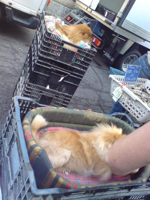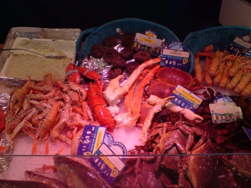 Breads, the usuals, but cheap. Cheese counters offering ten small goat’s milk rounds for ten Euros. A Euro each! A fishmonger later shouting: I DON’T DO THIS FOR PROFIT! I GET NOTHING! Perhaps the thought of doing such an honest guy out of his rightful excites the French?
