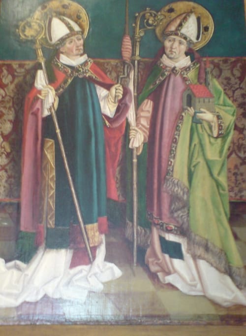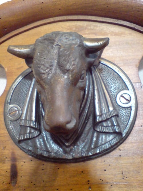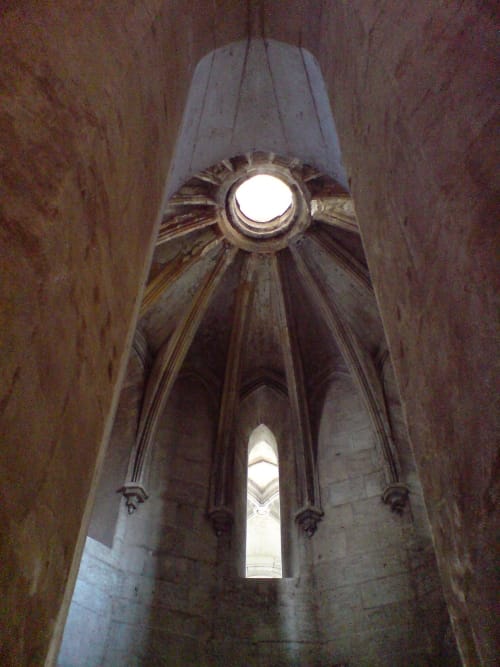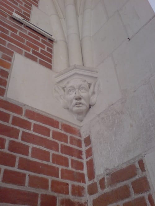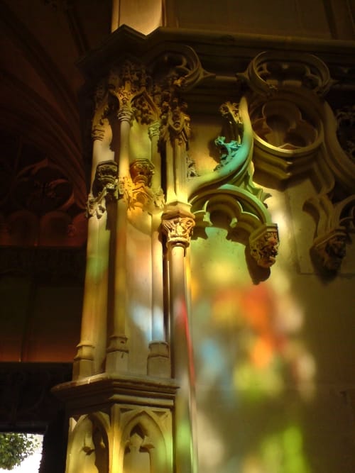 The chapel too deserves a mention, St. Hubert’s, built on one of the buttresses on the outside flank of the chateau, which rises sheerly, with this tiny building on its top. Last night at Via Roma, we had plenty of time to look at it, the lights on inside, lighting the stained glass windows. Antlers are built into the design of its spire. And on the tympanum, that odd conflation of medieval symbols: a stag – carved in stone, high relief – with antlers, from between which grows a crucified Christ – antlers and crucifix in metal, rusty.