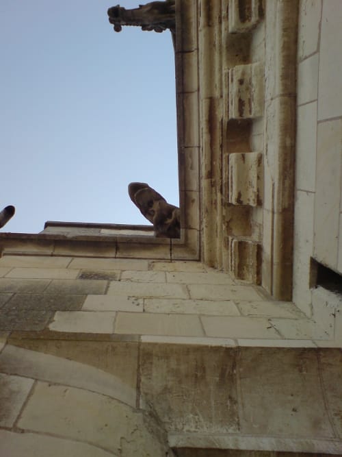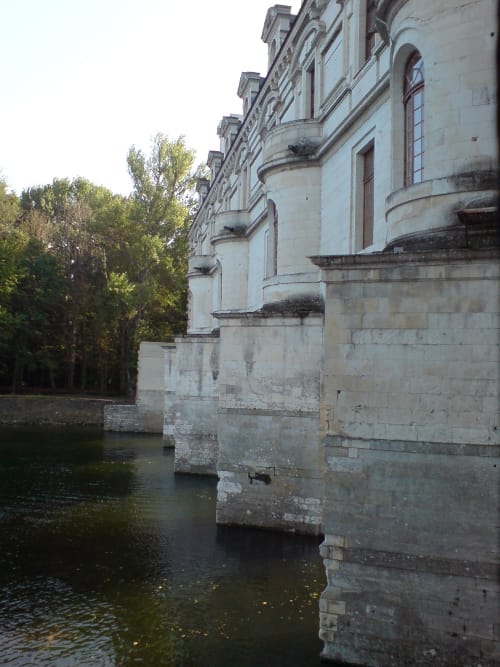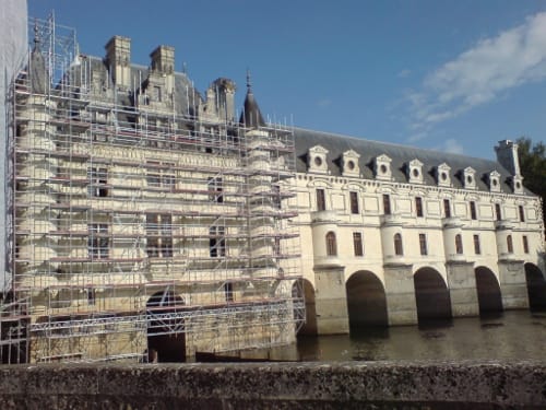 We misread the advice in our guide and thinking to approach through the gardens, designed by Diane de Poitiers, came at it upstream, after running around the maze. I’m growing fond of French gardens, with their wild floral borders and formal elements; here a low hedge scribbling curlicues on symmetrical sections of lawn takes up the majority of the space; a fountain playing, marking the centre with chance falls and splashes of water onto a stone bed. The guide said… But then going at it from the other better side, downstream, massive renovation work obscured a major section of the facade.