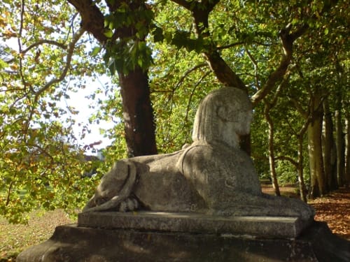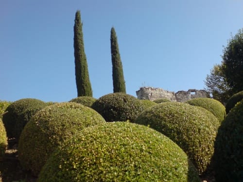 The garden full of bobbly trees. Formally arranged up the slopes towards the missing wings and bits of the chateau.
