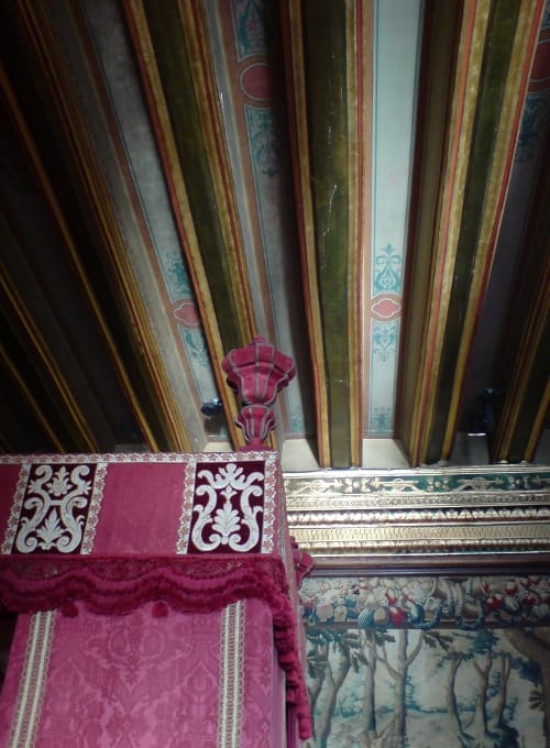 The most extraordinary room is that of Louise of Lorraine, painted a matt black with white chalky motifs on top of cornucopia filled with tears, interlacing thorny branches, and the quills linking her initials with his. She had this room done out in black upon the assassination of Henri III by the Monk, Jacques Clement, August 1, 1589. My leaflet says, She retired to Chernonceau to meditate and pray and was thereafter surrounded by nuns in white habits who occupied the chateau as if it were convent. In royal mourning, she was given the title, The White Queen.