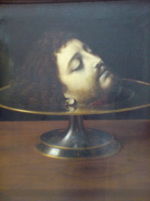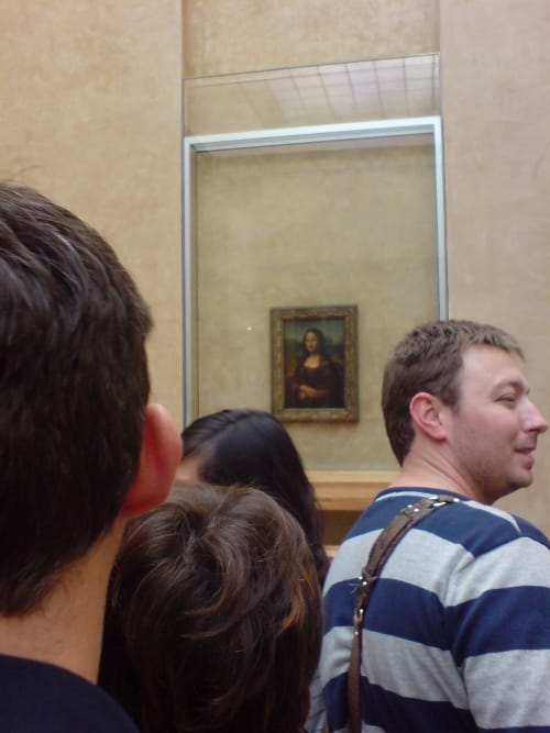 An enormous length of corridors. Then Mona. And a camera-sprouting herbaceous border of people massed about a plate-glass sandwich with the little window in it out of which peers … over the wood veneer lintel … and the seatbelt cordon … into the red flashes of digital cameras … who? I overheard a German tour-guide telling his group that it might have been the face of Leonardo’s male lover. The sillier the cult gets, the more readily people accept that it is silly. But go see anyway.