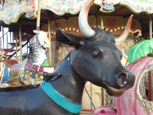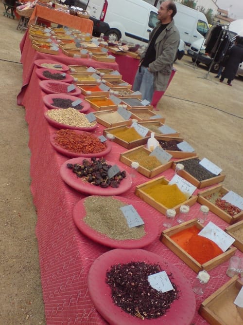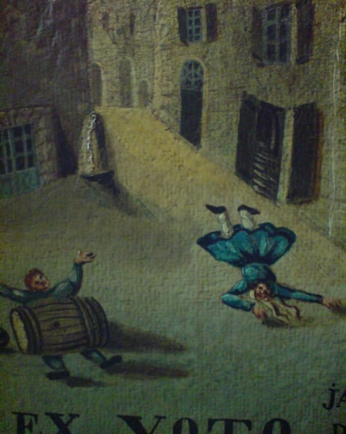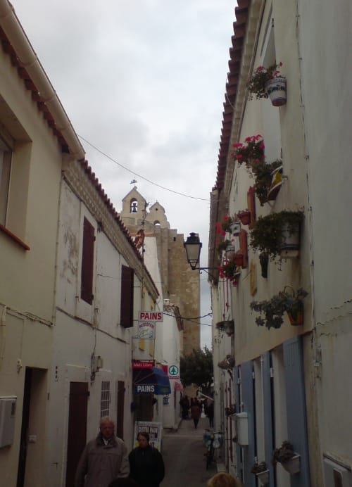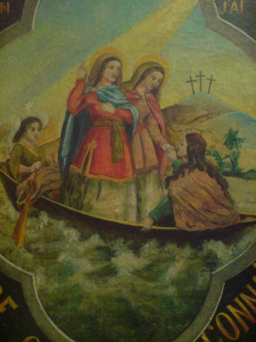 On the way we walked into another market, which led us to the church, the fortified church of St.es Maries. Meaning, perhaps, no windows. A dramatic gloom on the inside, candles around the altar, and spotlights illuminating the display cases, one with relics, finger-bones, mainly, sealed behind windows in reaching up silver hands, another with naive art, depictions of the St.es Maries. Above the altar, up too high to see clearly, and lit only enough to make it a mysterious presence, something that looked like a baby’s cradle, whether for death or life hard to say. Below the altar, breathing a warm breath out into the aisle, the gaping maw of the crypt.