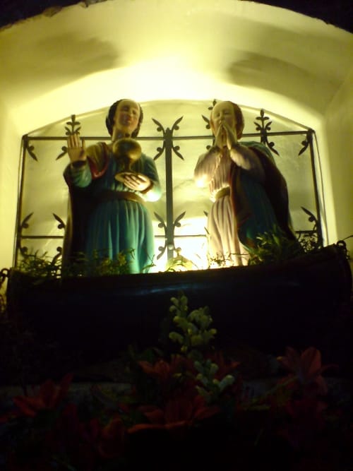 After the preparation of the main interior, this cave, lit with hundreds of candles, was scarily powerful. Here, Sara, patron saint of the gypsies, who is carried out to the sea May 24-5 every year, weighed down in layers of dresses, capes, as if without them she might shoot straight up into heaven. She, like the mysterious virgin of Le Puy, is another black Mary. You could see the affect she was having even on casual touristy visitors, drawing them in and striking them speechless. Like a true Roma idol, she makes people rustle in their pockets for change, to light a candle, make an offering.