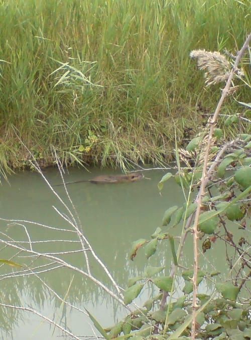 And then we saw beavers. Wild. Dodging across the path, swimming in the ditches and streams. First a long time wondering if there might be some there and we might see one. Then the surprise of a furry face being propelled down a muddy shrub-lined drainage ditch. Then several sightings as they crossed our path, behind, in front. Finally, one carried in a swift stream, snacking on something growing within reach on the bank, which we followed for a time.