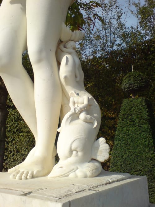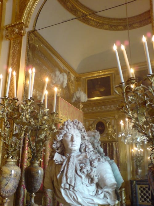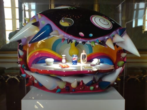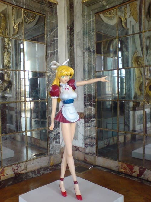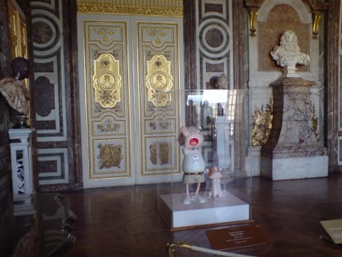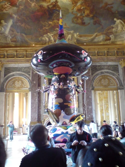 The famous mirrored hall is fabulous, in that you are able to imagine seeing it what impression it must have created when lit by candlelight, the flames reflected in the mirrors, suspended in the dark space between floor and ceiling amid the scintillations of the chandeliers. The idea that it can be used, the Palace, as an exhibition space seems simply wrong-headed. Busloads of tourists are not interested in Murakami’s kitsch. And I found the Murakami oddly didactic. Shouty in its aesthetic of OTT Nipponese cute and kitsch against the background here and shouty in its neutrality about its own aesthetic statement, its unwillingness to pass judgement. Hence the snap I snapped of the ‘icons’ of privilege in the toothy mouth of one his beasties: jewelled Pepsi, shoes, aspirational items. Yeah, there’s a hint of reappropriation about them, by the Japanese artist of the American item, but at Versailles the reading can’t help but be different. Less critical. More flatly neutral to the point of being complicit, celebratory even.