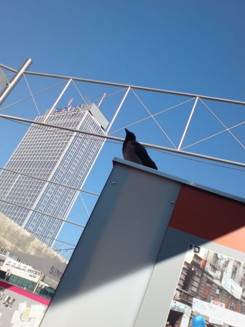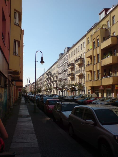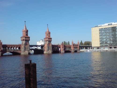 We went into the area famous for squats after the fall of the Wall, Friedrichshain, now rapidly gentrifying and cute and cobbledy, with low-rise old-style apartments painted in muted shades, cream, beige – or, as the Germans say, ‘yellow’ – through rose and russet. Here we stopped for lunch. An excellent toasted bagel, with red onion and jalapeno chopped up in the cream cheese and coffee.