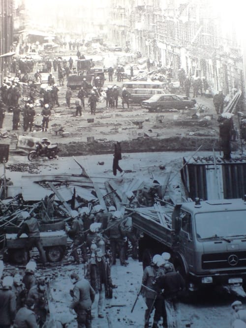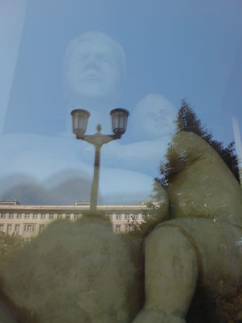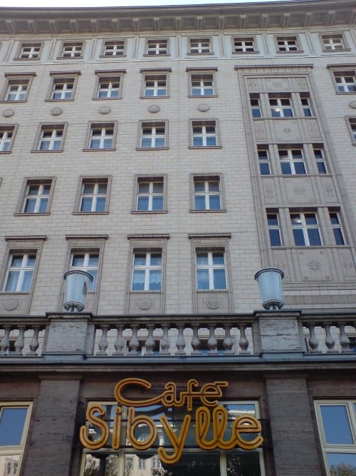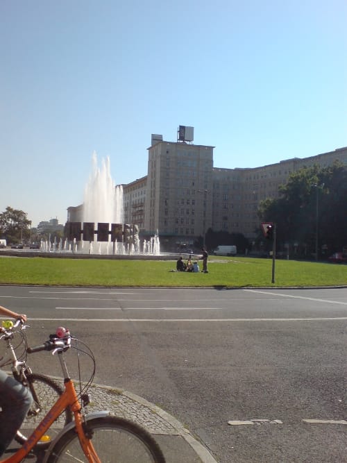 L. acted as our tour-guide today. Not quite the legato ramble we had planned. But worthwhile nonetheless and notwithstanding the final rush to return our bikes by 3:00 pm. We cycled the length of Marx-Engels Allee. Through the beautiful austerity of the Palaces for the People, apartments for the apparatchiki, nomenklatura and Party favourites. Imposing in scale, a mile or so, down both sides of the street, with pillared balconies, Soviet classicism, going up seven or eight storeys, with domed towers, in one of which the widow of the architect was alleged still to be resident. A continuous building, symmetrical from left to right across the chestnut-tree lined boulevard, with architectural breaks for movie houses, styled in a more modernist Soviet idiom. Sci-fi-like, a failed futurism.