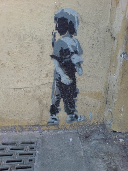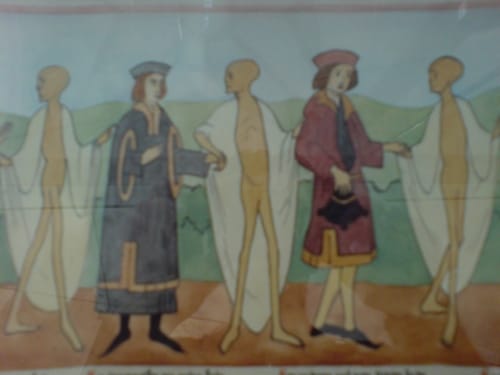 We got as far as Kottbusser Tor, an area I remembered, before we had to get the bikes back. We returned at great speed to make our deadline and making it had a brief look around the Marienkirche. Beautiful 12th century vaulted nave, de-catholicised at some point, a group of children on a field trip walked all over the altar, climbed into the pulpit, lists in their hands of the art on show, which was impressive. Especially, in the portico, a faded mural showing a dance of death, the death-figures alternating with lords and ladies in medieval dress, those funny doughnut hats with veils hanging from them in dark greens and reds. In the centre of the dance a crucified Christ, disappointed that he couldn’t join in, tapping his toes and drumming his fingers. The death-figures looked more like aliens than traditional skeletons, or human lavae, white aetiolated bodies. Cadaverous and otherworldly.