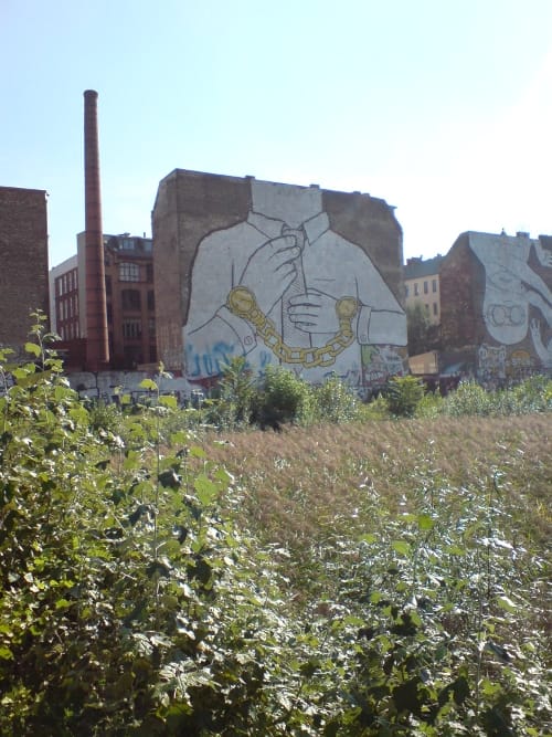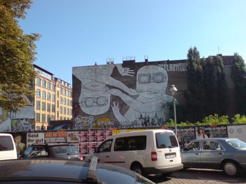 Berlin today had ideal weather for tourism. Which we kind of accomplished. By bike, courtesy again of Fat Tire Bike Co. After a false start at a shady Prenzlauer Burg bike-hirage place where the guy would accept neither my driver’s license as ID or deposit, nor my mastercard and I was not carrying my passport. He had that insipid hippy liberal exterior with that humourless and basically mean interior which seem to go together as flavours of personality, the latter also a characteristic of those who deal with tourists: flint and petuli.