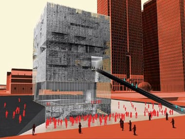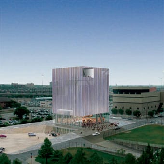 The Wyly comprises eleven storeys of height as a pure vector of movement, vertical flight; the floors take on the aspect of curtain-floors, like curtain-walls and flutter, float, or, again, fly. The real curtain around this real theatre – construction began in 2006 – opens not on a stage but on Dallas, the city, and, equally, from the point of view of the theatre, the spectacle, the soap, in a reciprocity of stripteases. The excitement here is the building’s dandiacal audacity, which is in part a camp reversal of the roles played by city and theatre. The city finds itself at the heart of the theatre and at heart theatre: the curtains open and what is revealed is the city-setting. The Wyly bears witness to its own drama: it excites because it is able to be construed as an act of imagination, theatrical imagination, architectural imagination, as much as it is actually constructed as an imaginative creation, a creative creation, by an artful art. It is a play on itself.