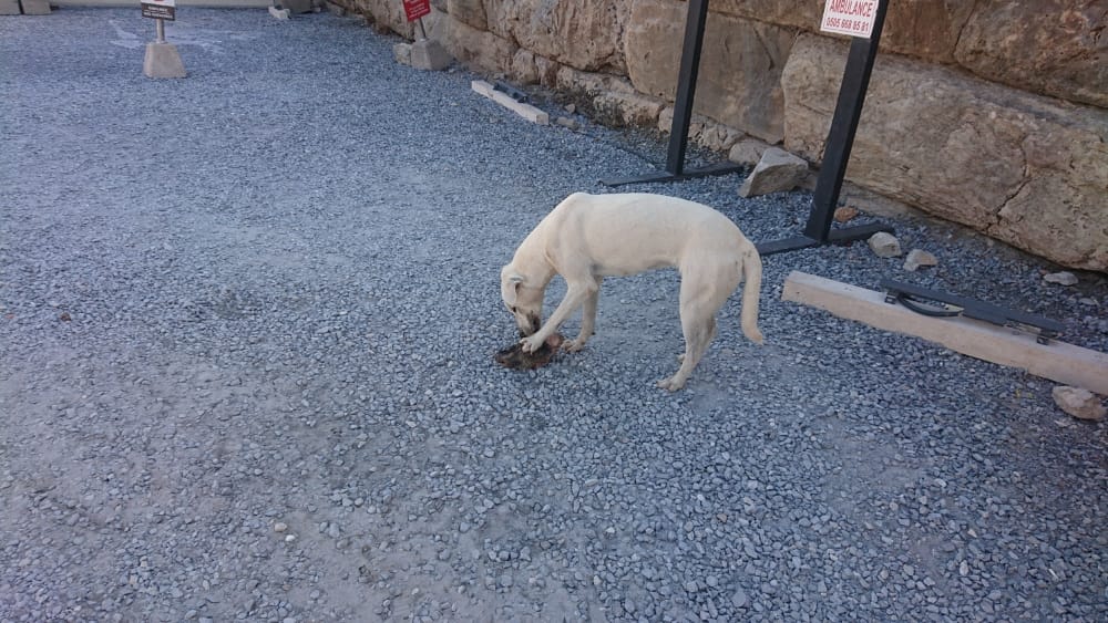 Dog eating sheep’s head before amphitheatre,