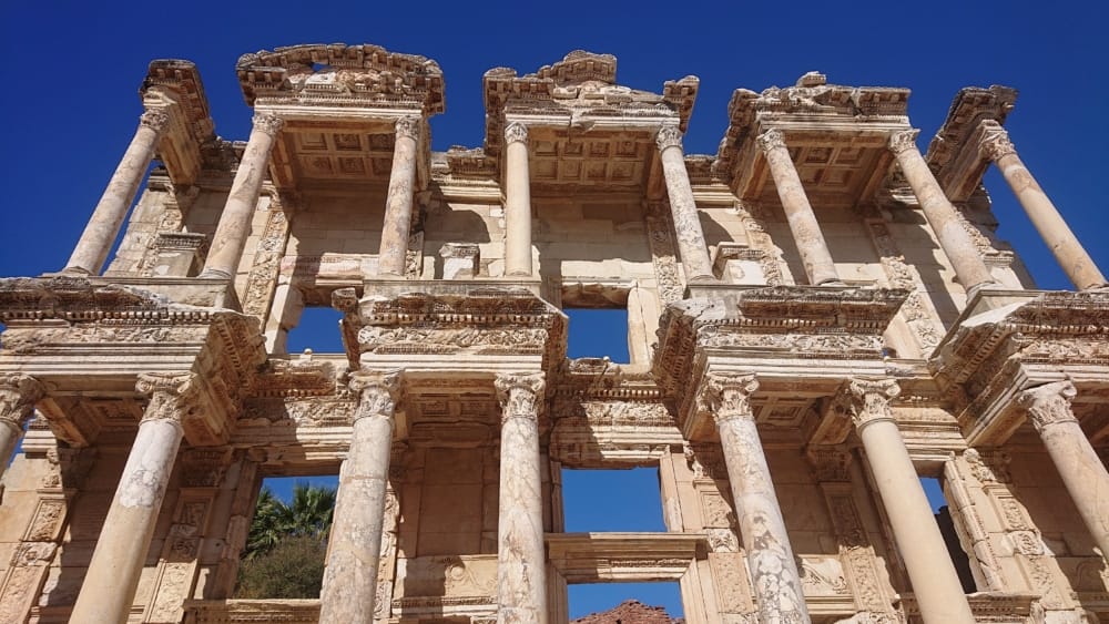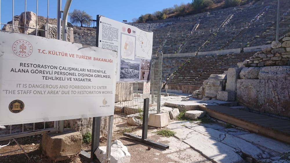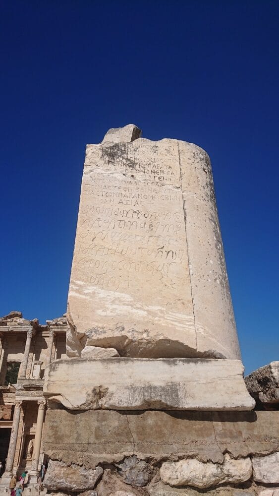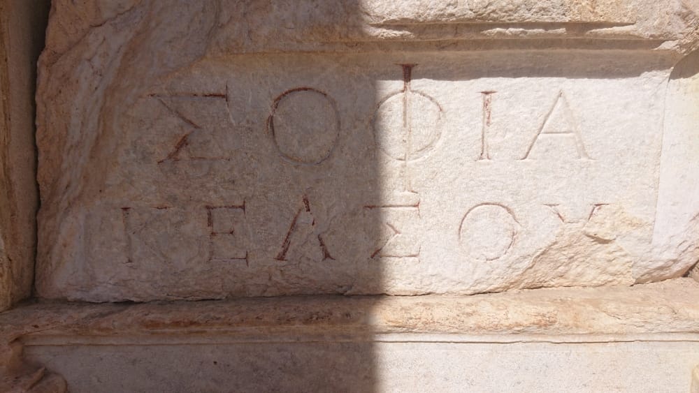 Ephesus, despite moments of agoraphobia in the Terrace Houses, packed out with tours, and an American woman floored by the heat, her tour delayed, giving us room to breathe, didn’t disappoint. It was gratifying being able to piece this puzzle of history together, Why are the Greeks after the Romans? when the Greeks precede the Romans? … And fun to read a translation of a wall of text about raising money to build Ephesus and turn a corner to see a board showing the company brands contributing to its restoration.