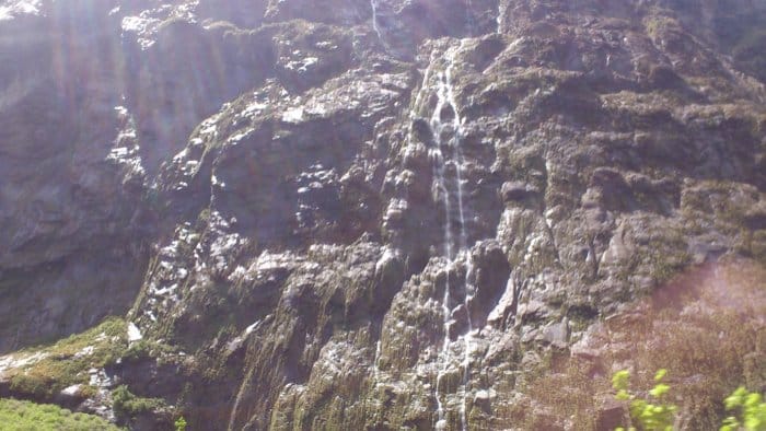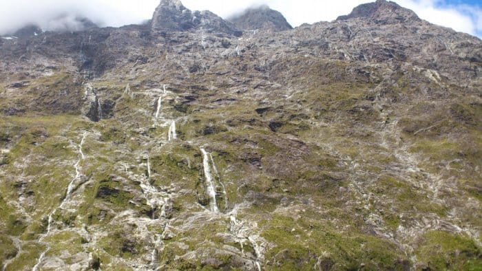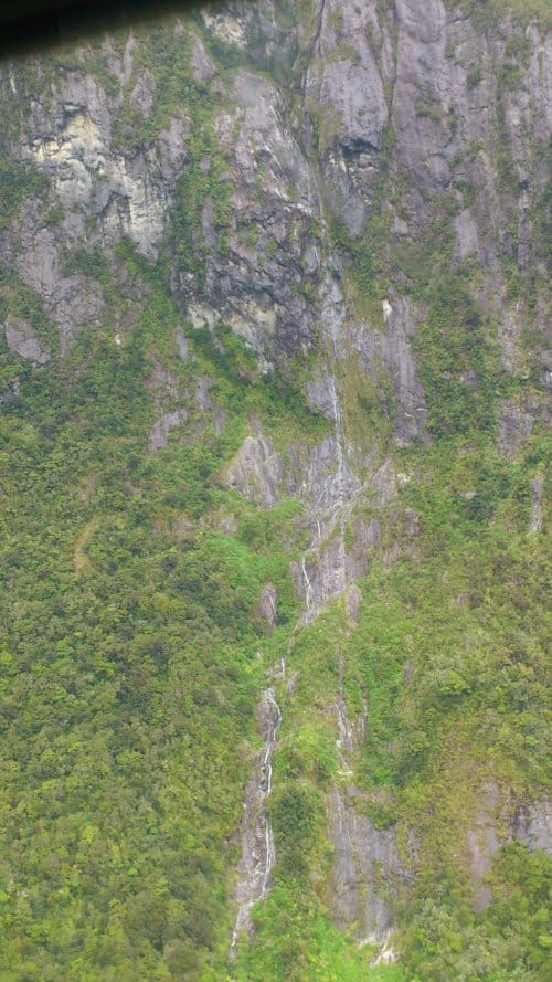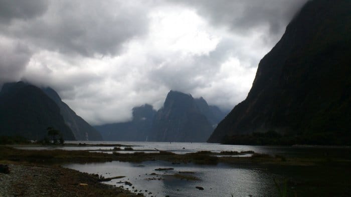 passing into the entry to Milford Sound, which is in fact the only true fjord in Fiordland, which is in fact misspelt,