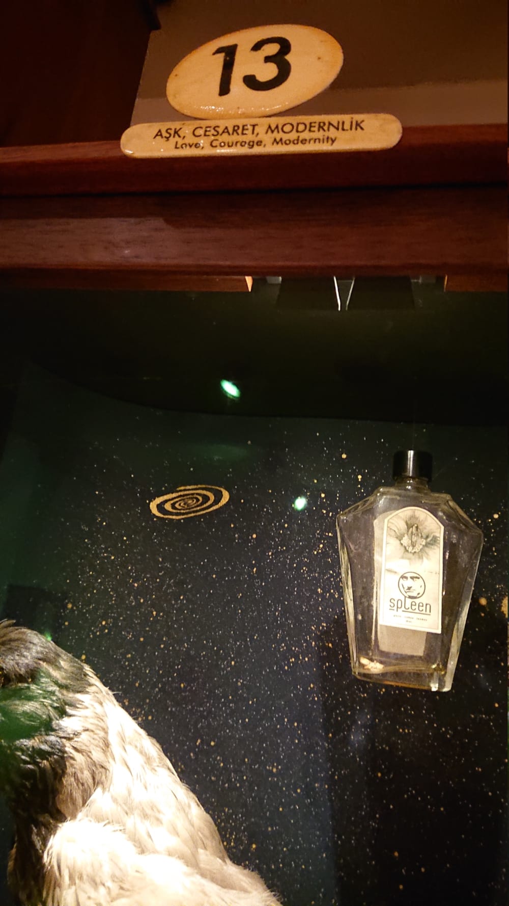 Here are depicted, to borrow something of the tone of the narration given in the audioguide, the back of a Turkish crow, a spiral, which since it concerns time will be a recurring theme in the museum, and the perfume Kemal buys for Füsun, the love-affair being at the centre of the novel’s spiral–and the time-frame of the museum, which sort of rises through 3 floors expanding, through 4 if you count the bookshop on the bottom floor where the novels of Orhan Pamuk are sold, and threads its end through itself, contracting to the most significant of the displays, on the ground floor, which we will come to.
