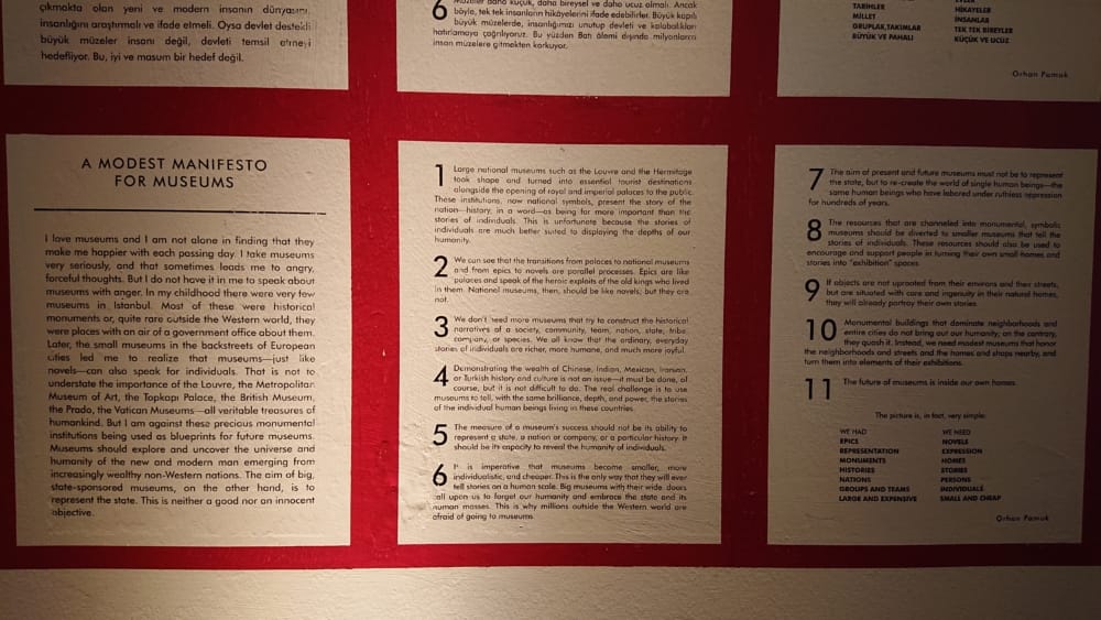 Here is Orhan Pamuk’s manifesto for museums. Its modesty resides therein that it still considers itself a museum, and also its immodesty, which goes to the memorialisation of the novel and is in keeping with it, that is, is in keeping with the respect the author shows for the existence, the real existence, of his character.