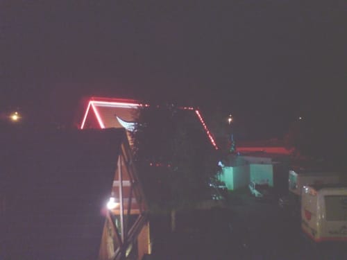 And all hashed out after our ‘medium’ French beef burgers – raw mince – at Buffalo Grill, we find ourselves staying with the Spanish cycling team. Who are very quiet. Hopefully as gorged as we are on prime Limousin protein. The Grill an exercise in the old-fashioned roadside family restaurant. Although still people queuing to get in at ten at night. We had to wait twenty minutes. Before being ushered to a booth, luggage racks above our heads, and a red-tassled lampshade hung low over the table, the whole melange in gawdy red and shiny black and brown, with brass highlights. I ate a ‘Frenchy Burger’ – the Frenchy bit, goat’s milk cheese. The green salad side turned up in a sea of vinegary mayonnaise. The salad in the burger amounting to no more than a wilted leaf with a coin-sized piece of red onion. Q. loved it.