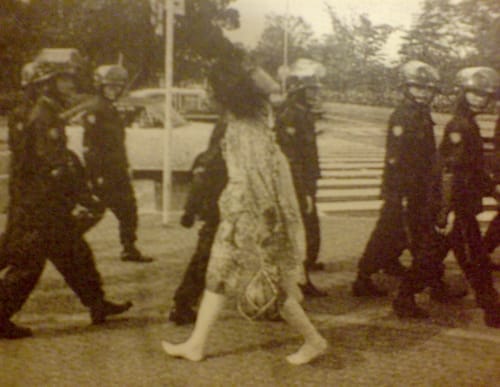 Ankoku Butoh would be an art form whose social threat and negation proved insidious and virtual, rather than explicit. Rather than Hijikata, it would be Genet himself, during one of his visits to Tokyo … , who took part in the most violent Shinjuku street-riot of 17 December 1969, opening himself to physical danger by taunting and harassing the riot-police lined-up before the thousands of protesters – while Hijikata, as the photograph of him carrying a watermelon indicates, was heading off in the opposite direction at that moment, increasingly swallowed-up in his own, insular concerns.