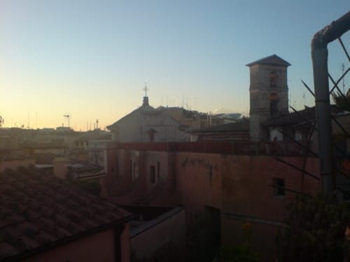 the last powder rose cloud has fallen into ash. I look out over rooftops, unsurprisingly roman-tiled, the pretend roof of the local church with its unencumbered upright facade like a Hollywood backlot – the belltower free-standing and utilitarian on the flat roof – towards the Trevi, il Fontano di Trevi, a corner of it visible from our balcony. I say a corner as if it were a small thing. But we are directly in the middle of one of the world’s great cities.