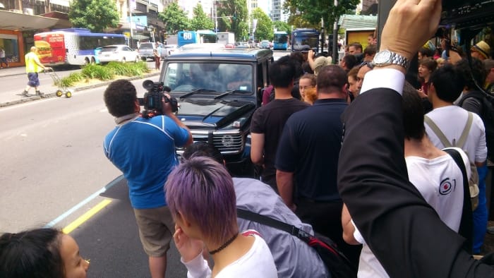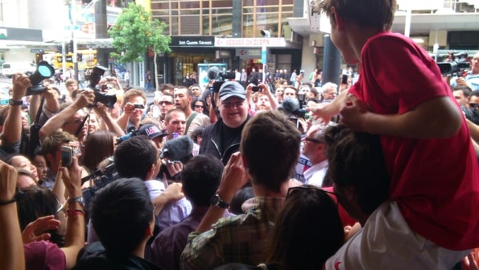 It was a nostalgic event, harking back to NZ’s traditional support for underdoghood, Unterhundkeit. But Kim? Or harkening back to Father Christmas creepiness. A young woman in front had her lipstick out to make a heart for Kim. & da Family? or just his big heart.