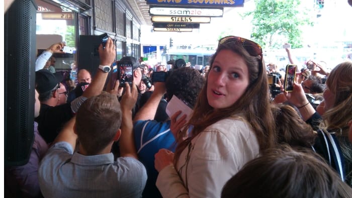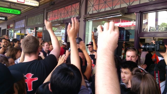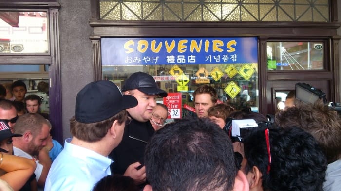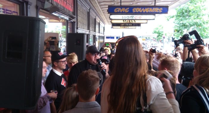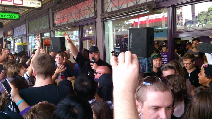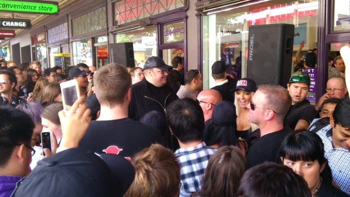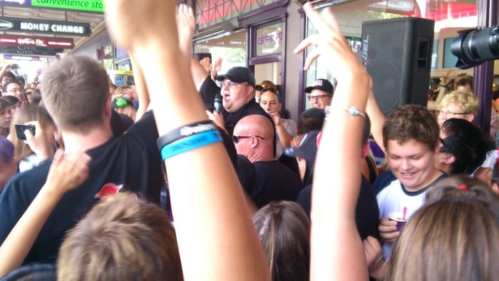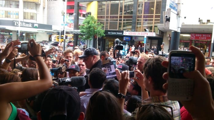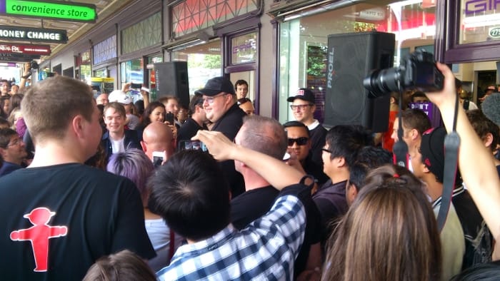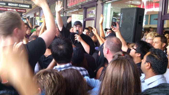 He answered, It is an historic occasion. He wanted to be here to witness it. … With his wife? With his son? … It didn’t make sense but then he made sense by letting me go first in the press of bodies to be closer to my son… Kim amped up the atmos, saying ice-cream for all but only ten punnets will have Golden Tickets. Only ten lucky ice-cream eaters will go to the Dotcom Mansion – rented – for the Mega Launch…