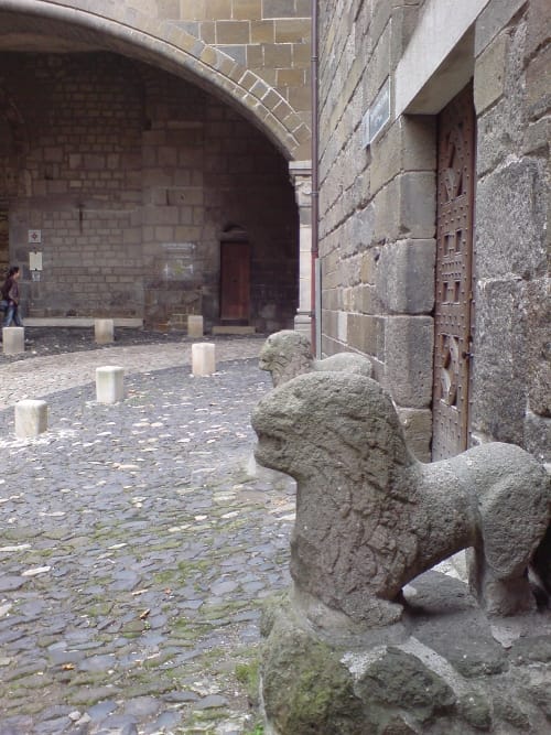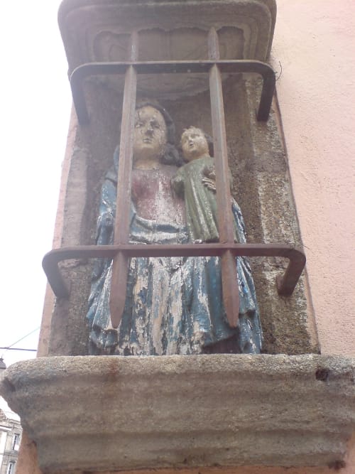 We made it down, and up, to the Cathedral’s cloister and sacristy before they too closed, closed again, this time for the evening, which starts at 1700 hours. The Sacristy was a shop. We visited the Cloisters, which, although reputed to be some of the most beautiful in Europe, were peaceful, interesting in terms of variation in capitals, and featured an amusingly grotesque frieze under the eves, on the inside, showing ectoplasm coming out the mouths of maids and demonic faces and chimaera of various sorts, but were most striking for being the object of the giant metal Madonna and her Ward’s gaze.