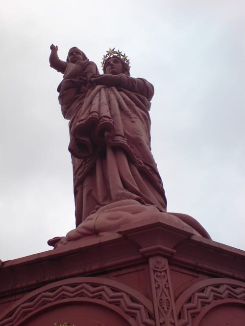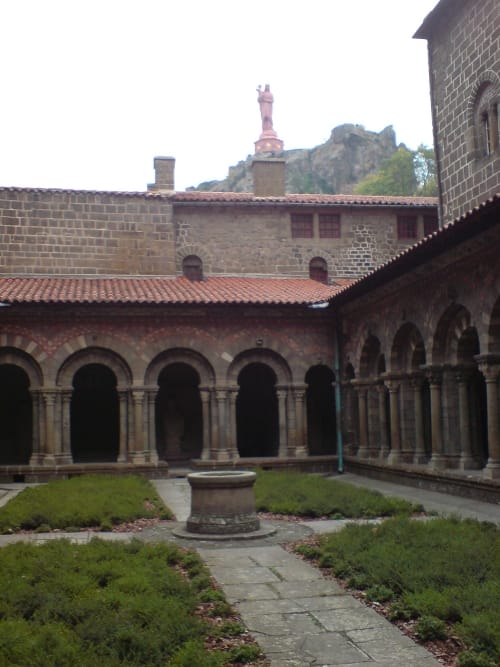 Down the hill we went, determining instead to climb first to Notre Dame de France, the metal terracotta-coloured Virgin with her miraculous metal boy on her arm who looks out – in actually a very specific direction, into the cloister of the Cathedral, as we discovered – over the town. The cloister was also shut for lunch.