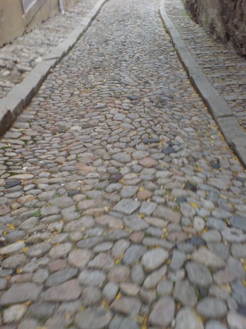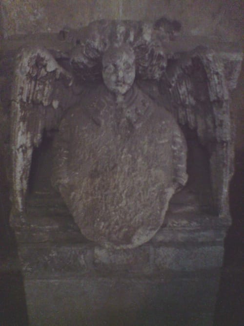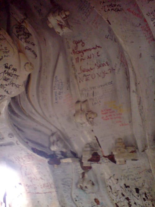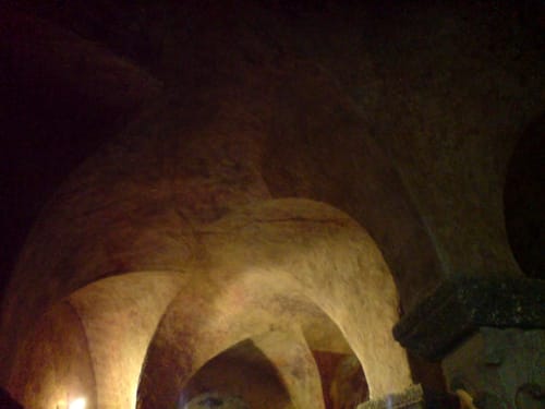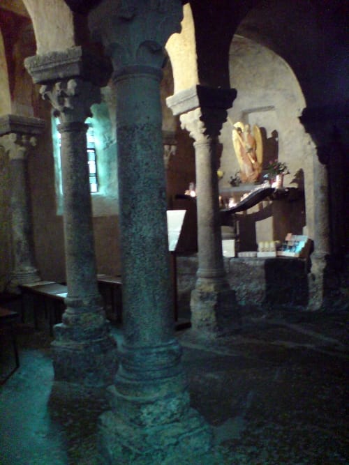 St. Michel, when we’d made it up the over 200 steps, was another, like the Cathedral, of those religious sites warmed – literally – by its own mystery. Much of the chapel dates to the tenth century. It was built on to accommodate the growing number of pilgrims. The kind guide offered to show us the treasures uncovered during restoration work after the depredations of particularly the nineteenth century, when, allegedly, it was painted over in yellow, and chipped away at without regard for the wall-paintings; add to this, of course, or subtract from it, since it was probably the stratum that the paint was intended to cover, the chipping intended to remove, layers of soot from candles over a thousand years, and the grease of hands, and whatever else might accumulate over such a long period. It had been quite black, our guide said.