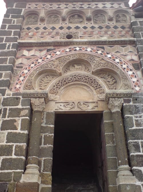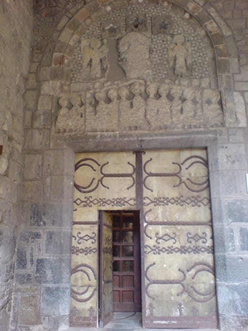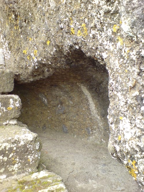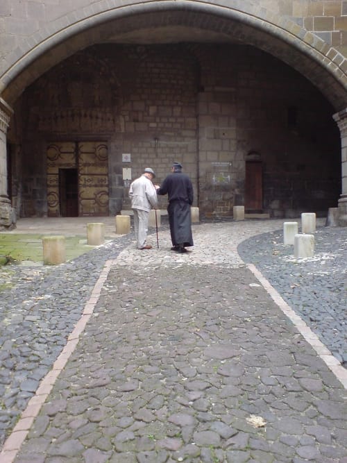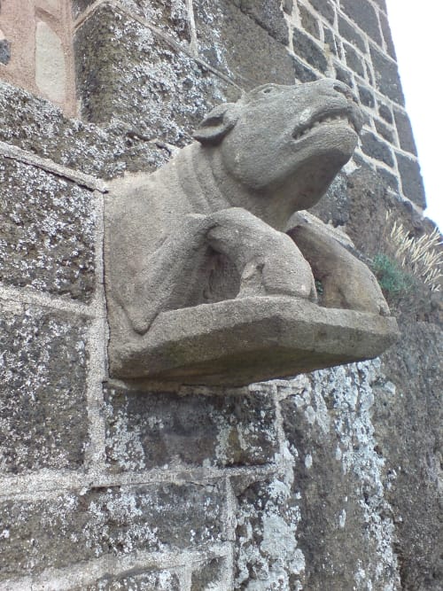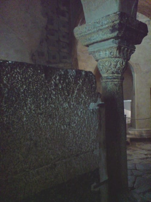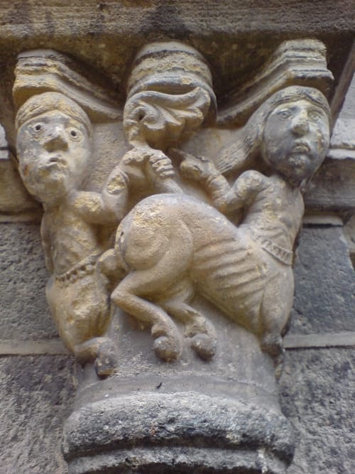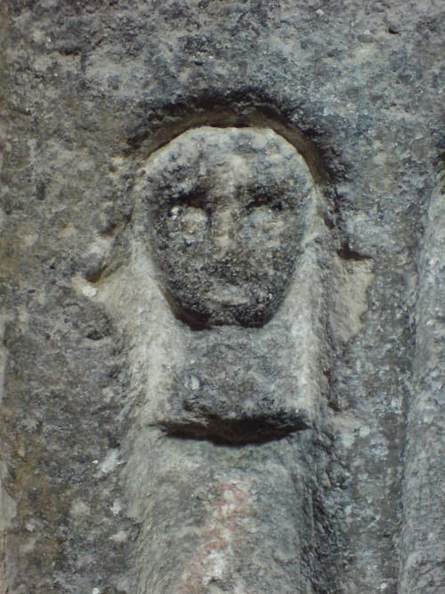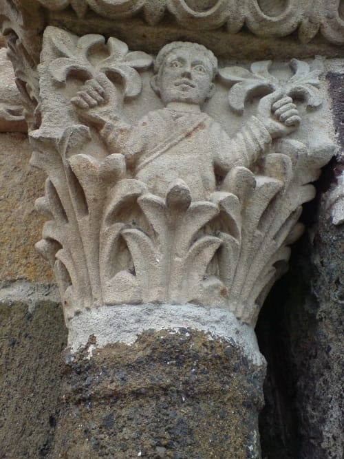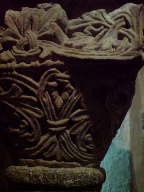 She showed us the stone that had come from fifteen kilometres away to make the pillars. The stone of the dolmen, a wall beside the unique side nave. The floor as it had been a thousand years ago and as it had been a mere nine hundred years ago. And the capitals of the pillars, ornamented with animals, including rabbits, bears, or dogs – there was some confusion – leaves, and some of a celtic design, using interlace. The deliberate quotation of styles that were native to distant lands made me think that that also went towards the idea of their preciousness, that distance for people who didn’t easily travel equalled wealth, as did the very height of the pinnacle on which the chapel sits, for people who didn’t fly. The formula: distance = wealth. Conquering distance, whether vertically or horizontally, being a godlike quality.