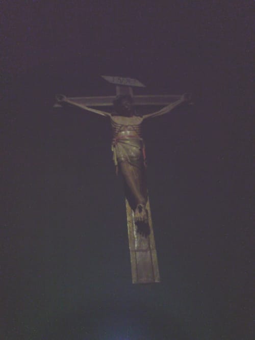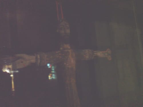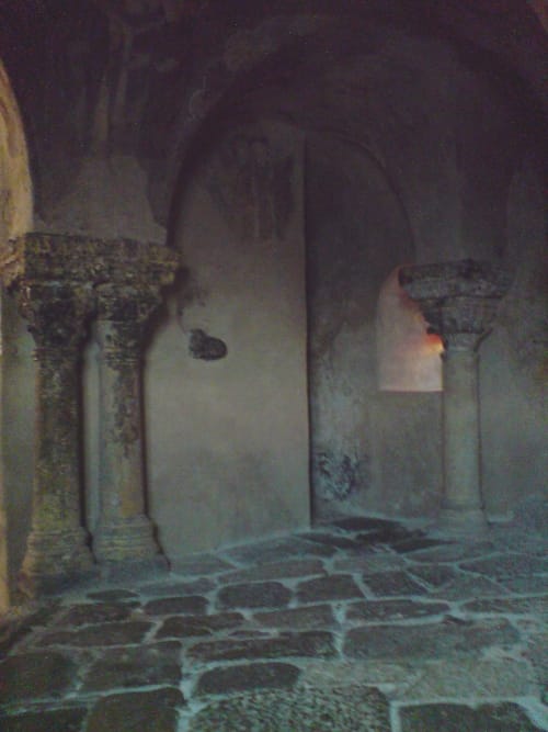 She showed us a crucifix made of olive wood. Beautifully simple. Christ as the wood itself, arms out-stretched. A thousand years old. A piece of stone from the first apparition of Saint Michel in Italy. An ivory box. A round box the crucifix had been inside, with a Spanish name. A silver cruciform box, nothing in it. Fabric, woven in patterns, fine fabric, Byzantine in provenance. She pointed all this out with her torch. Then moved on to the images in the arched vault. In which the sabots the people wore and the excellence of the horses are worth mentioning.