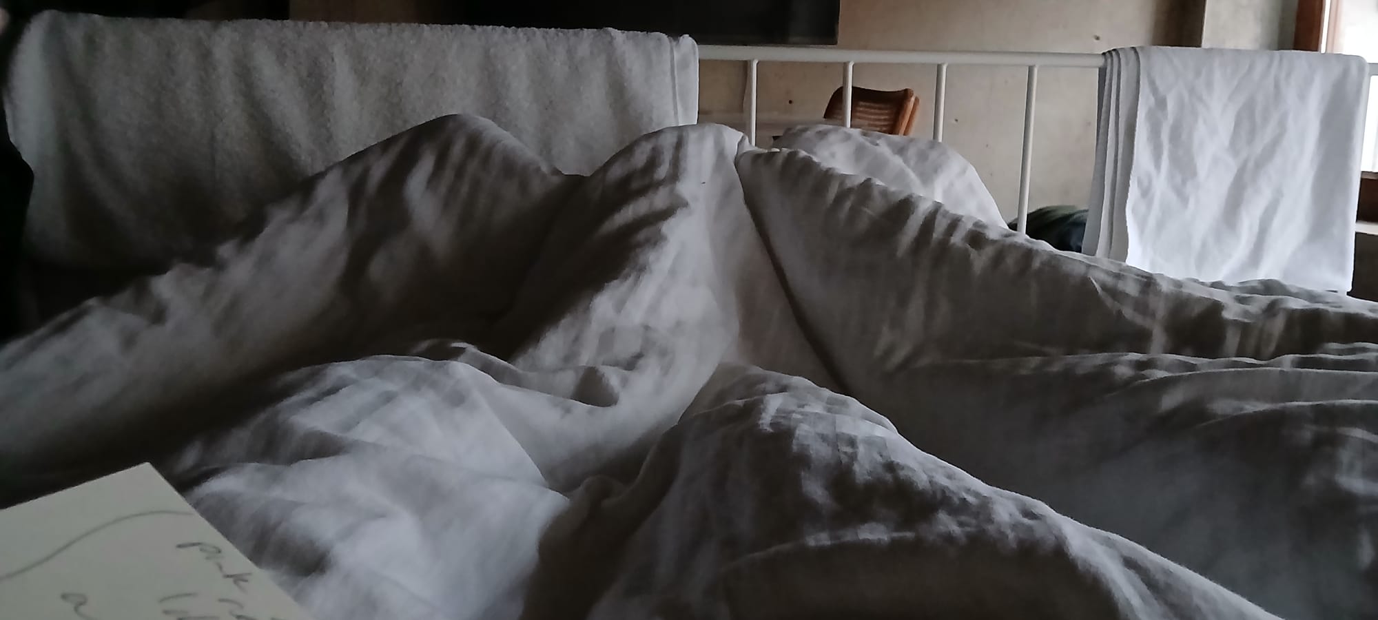 My chain came off halfway up the hill. The lower bracket sounded like the bearings were toast. The left pedal crank was bent. Jo's would not change down to lowest gear. . . yet, initially full of good will, towards all creatures and machines, we pedalled. Past the big houses. A great place if you like big houses. Past the cows. Past some mangy sheep with bells. Past hippy coffee stops done up with picturesque garbage. A great place if you like hippy picturesque garbage. To the bottom of a steep cobbled street, where we dismounted and pushed and pushed and pushed. . . towards a nice view and a cosy church, with Christ who all this time had been recumbent on his painted pillow.