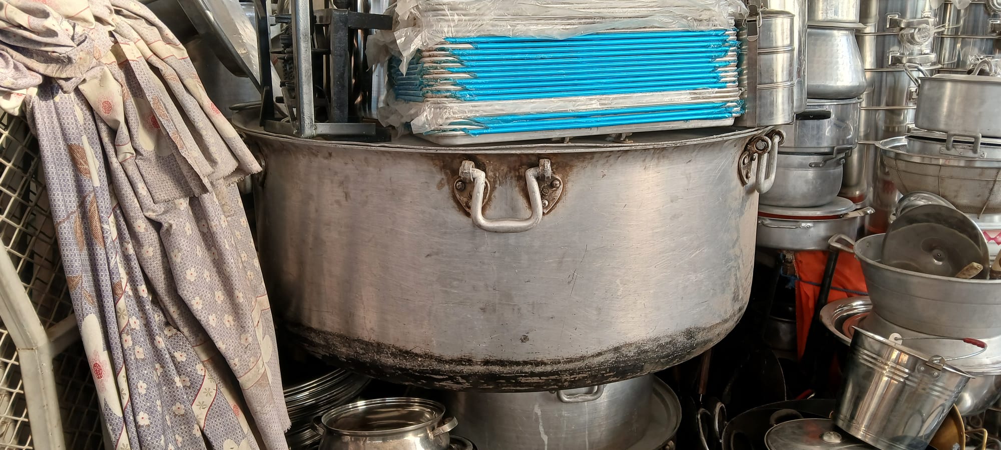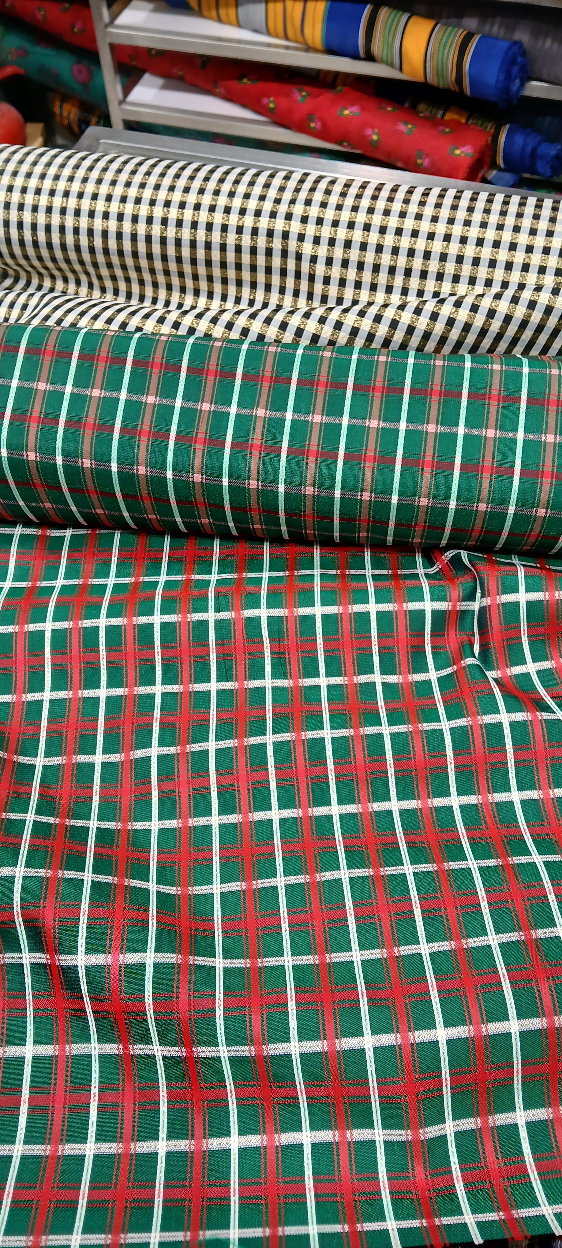 the selfie with this proprietor: the shop itself is perhaps a little fusty, high ceilings showing the ducts and bits common to mall shops, and high up on the walls sample dresses on rough-sawn painted trellis, an 80s air then of time-capsule, encapsulating the proprietor, to whom we are not, out of politeness, first drawn, but to the peasanty regional-type frocks on racks adjacent to the door, these among the only finished pieces, for sale but equally on display, the rest of the store given over to a storehouse of a vast number and variety of fabrics, folded and in rolls, piled up along aisles running through the middle, the desk to our left, with a curated collection of suitcases, a typewriter, props from a dress-maker's life, and the proprietor himself starting to speak. . .