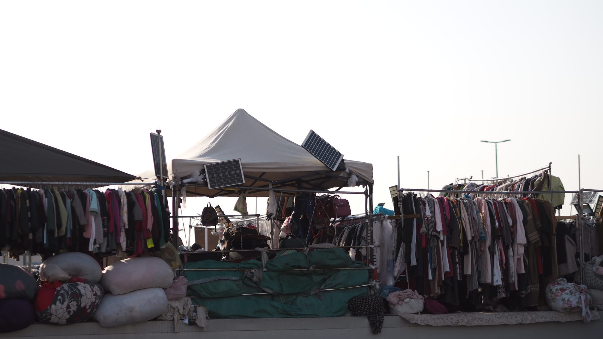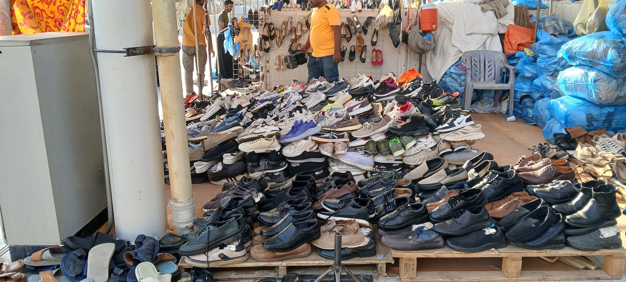 in fluent English, a largish peanut-shaped head, bald, a proprietary air, his assistants busy being busy, thobed, sandaled, them and himself, dressed for business, and he most animated, wanting to engage, which we initially take for wanting to make a sale. He wears rimless glasses, one eye is disconcertingly much larger than the other and, unblinking, glass. We approach and he asks our business, film I go along with, with which he starts to expatiate on his career as a costumier, film, to stars. He finally brags, admitting he is bragging, he owns the dress Marilyn Monroe wore when she sang "Happy Birthday Mr. President" and shows us on his phone, a reminder:
