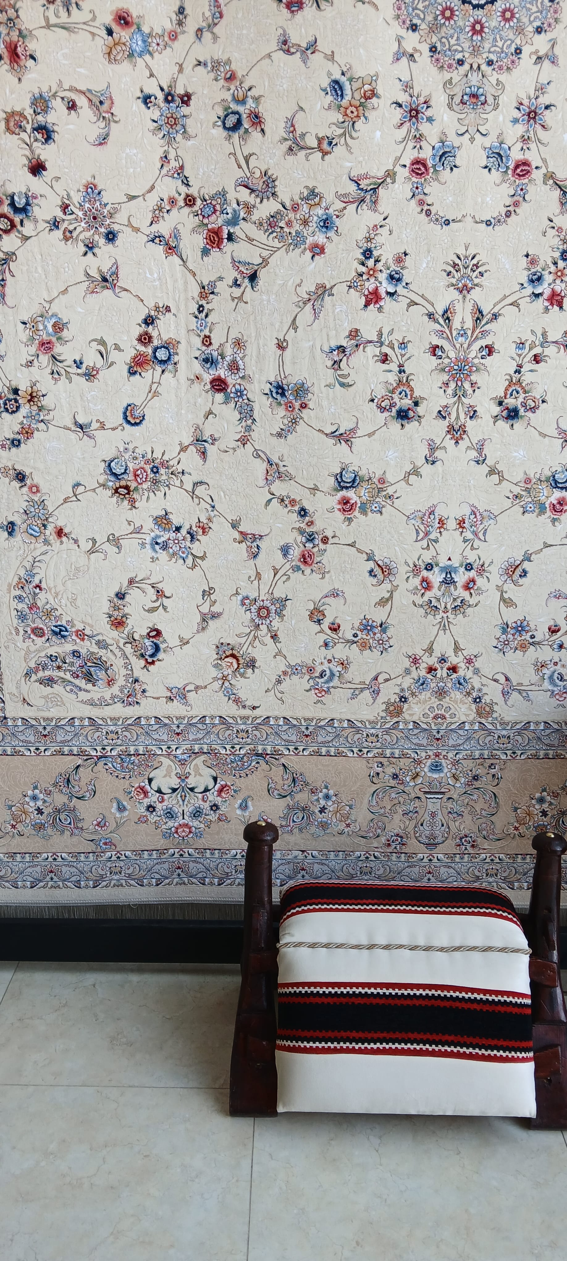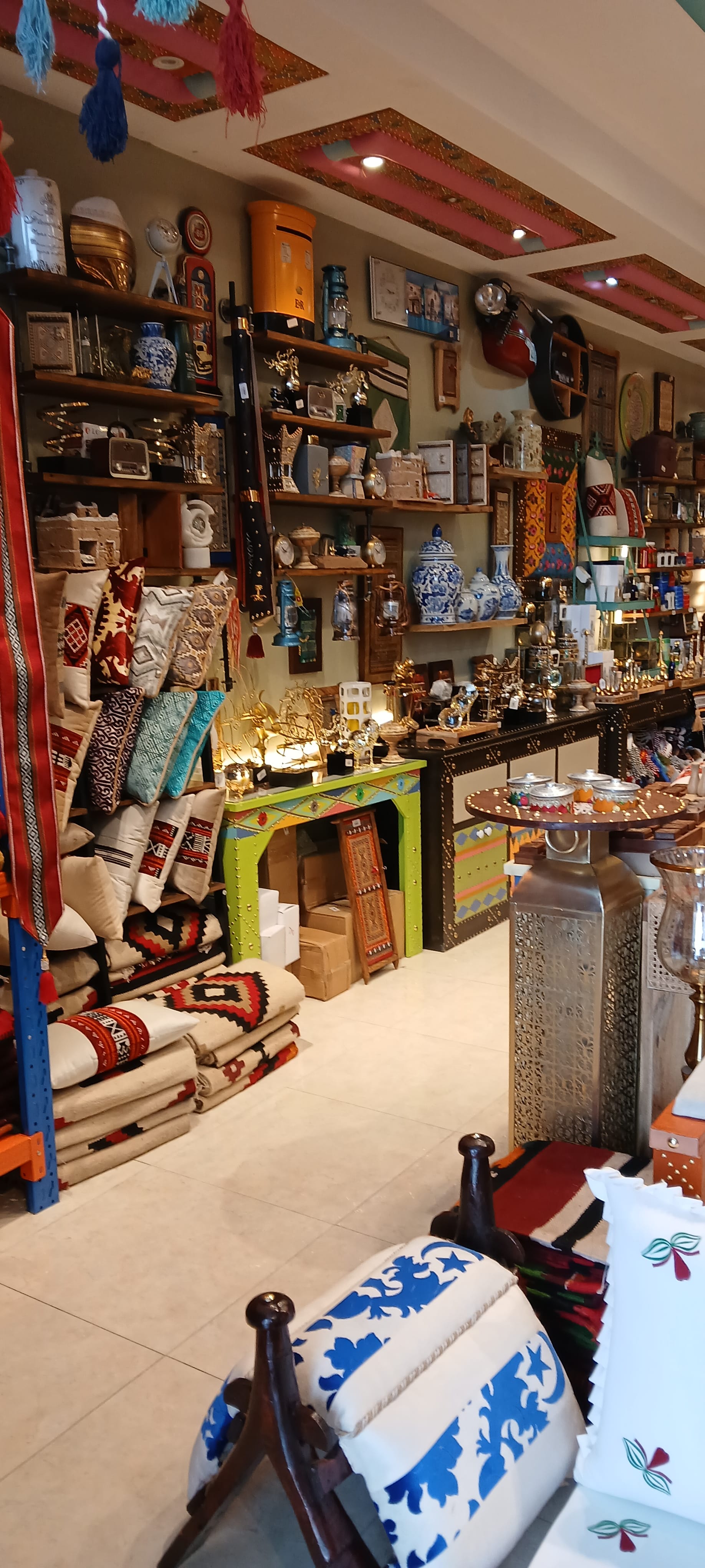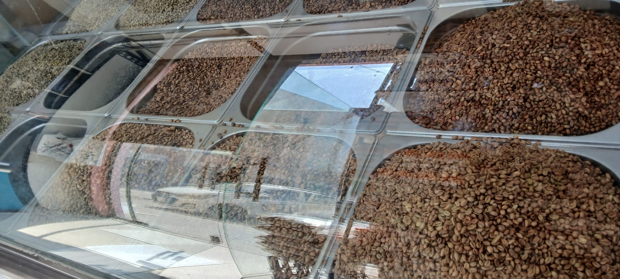 if you were able to zoom in you might see the dark roast top left, and below it a lighter roast—the greens beyond are Arabica, which, mixed with cardamon and other spices, is the coffee offered to you in shopping malls, in hotels, in people's houses, light-coloured when brewed, in tiny cups, with dates (personally I need the dates otherwise it sours my stomach)—I asked for 200gm of the dark, Türkçe, it turned out to be, and 100gm of the coffee below it, Ethiopean, ground finely, esbiriso, and naem, mixed together, which we have been drinking since. And today I drink the last of the Brazil blend, that it does not surpass but surprisingly equals in strength and depth of flavour. Although I admit it does lack the pinch of spice we get from the peaberry. . .