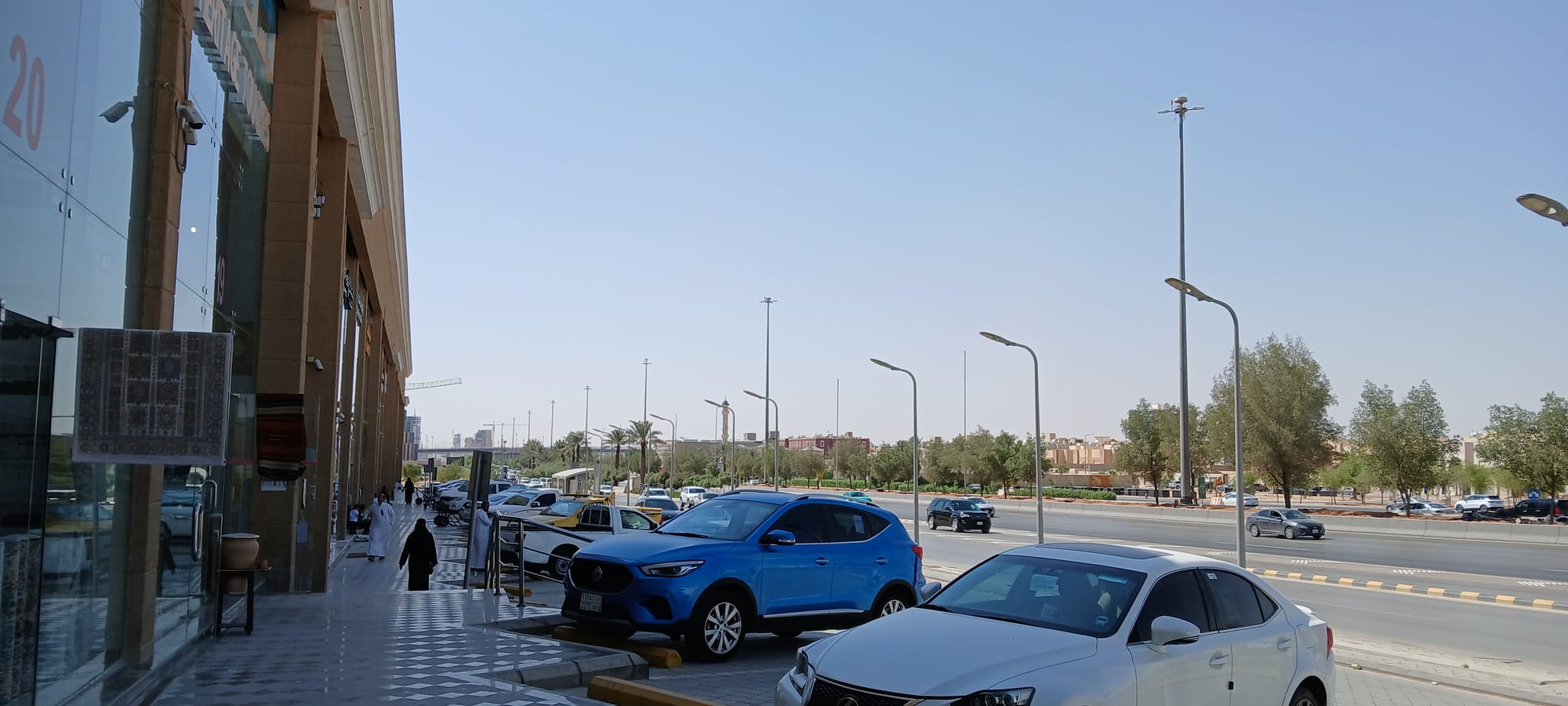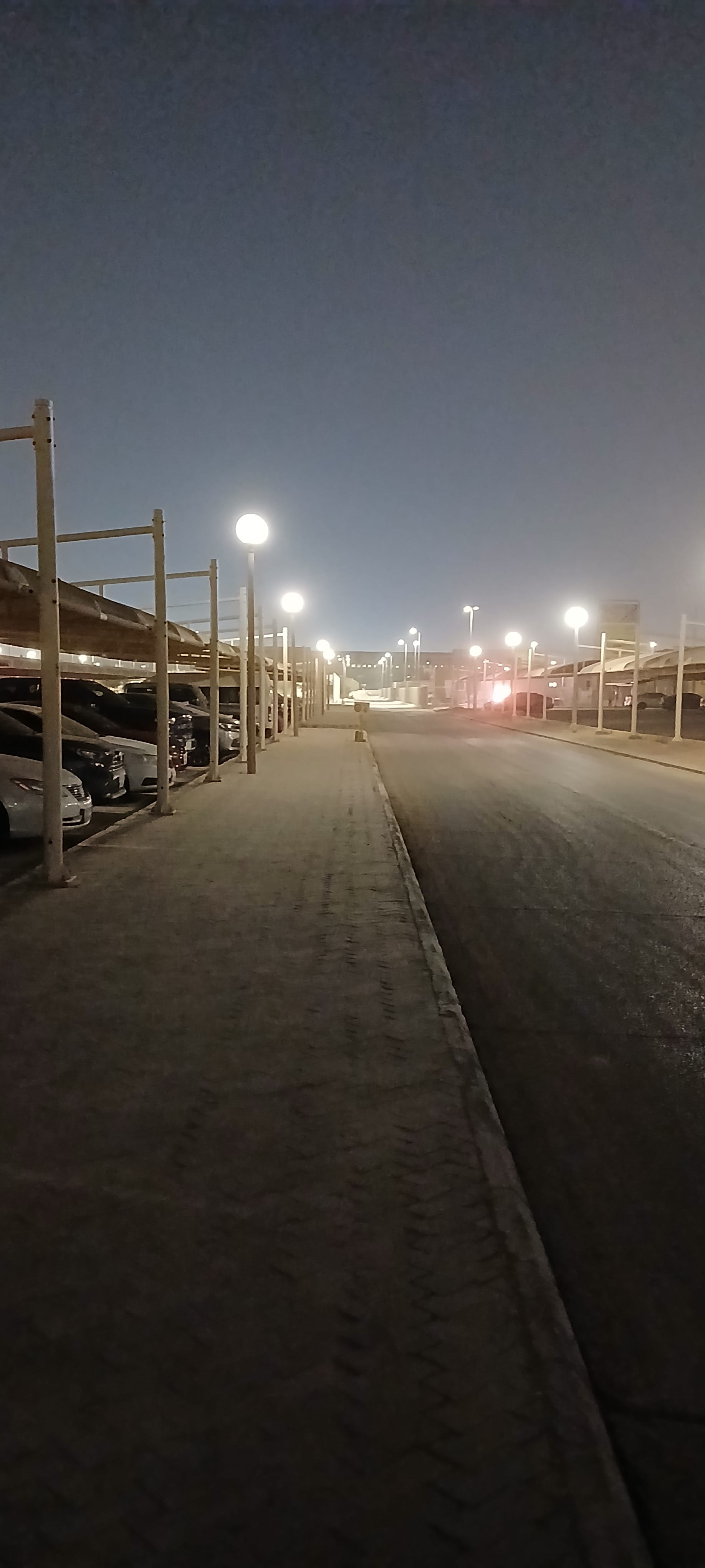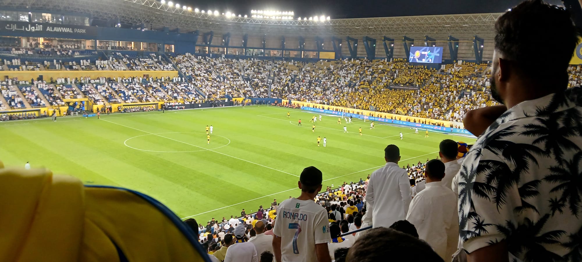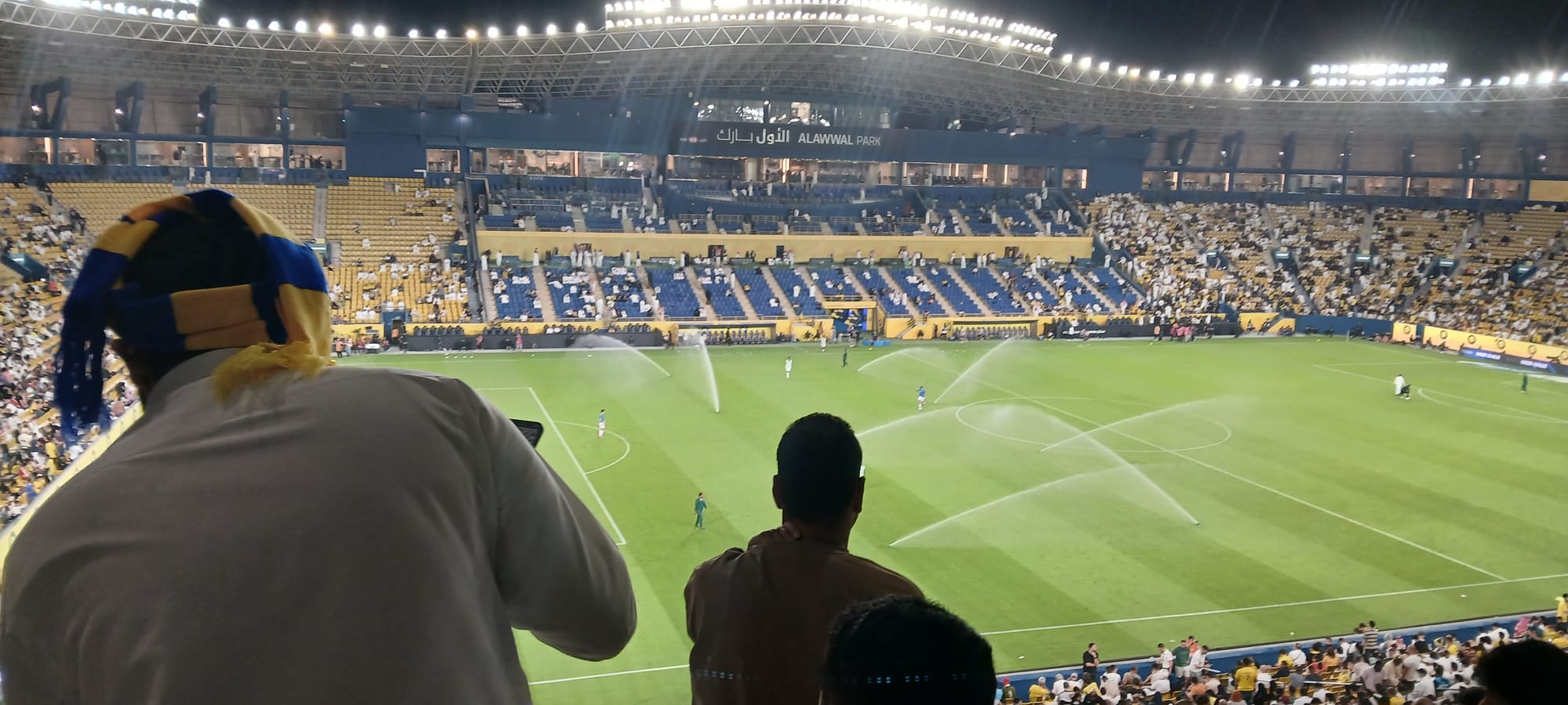 so we started out descending the hill to the left of the gate we entered by, following the route taken by the bus which got us to the stadium, and then left, along the line of the barrier illustrating some coming-soon development, and left again . . . in the warm night, enjoying, however disconcerted that we hadn't heard them or had heard them coming from another direction altogether, the building noises which are as ubiquitous a feature of the nighttime as they are of the daytime, enjoying the diamonds cast, the footpath having, as often happens, run out, by the oncoming traffic on the shining polished asphalt, but not blinded by them and seeing the kids standing up in vehicles with sunroofs and the young and excited men waving Nassr team flags out car windows, and left . . . to wind up back at the stadium gate again. This called for a rethink. Where had we gone wrong?