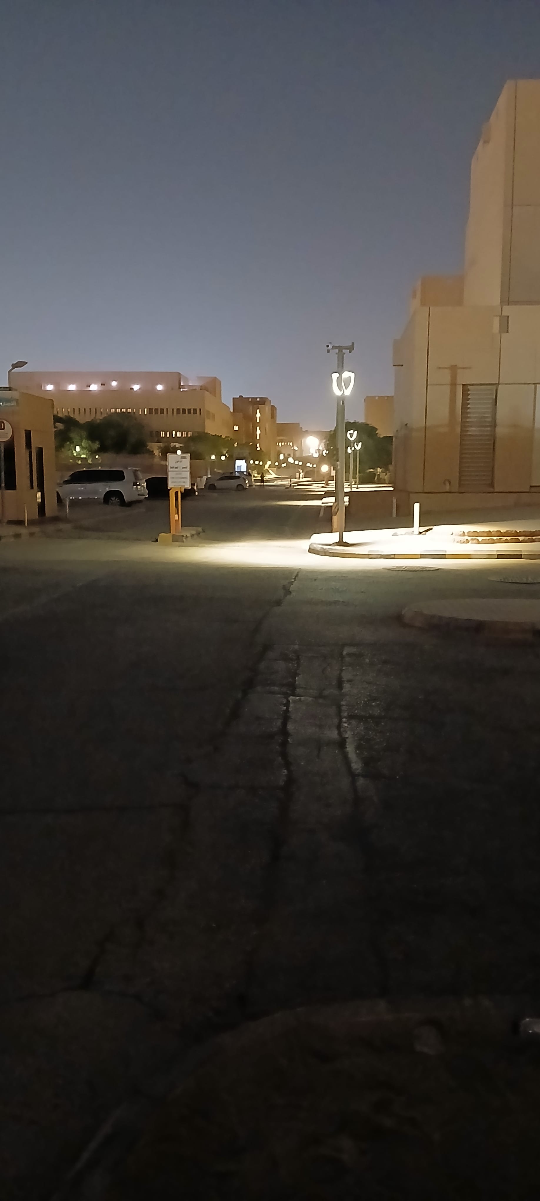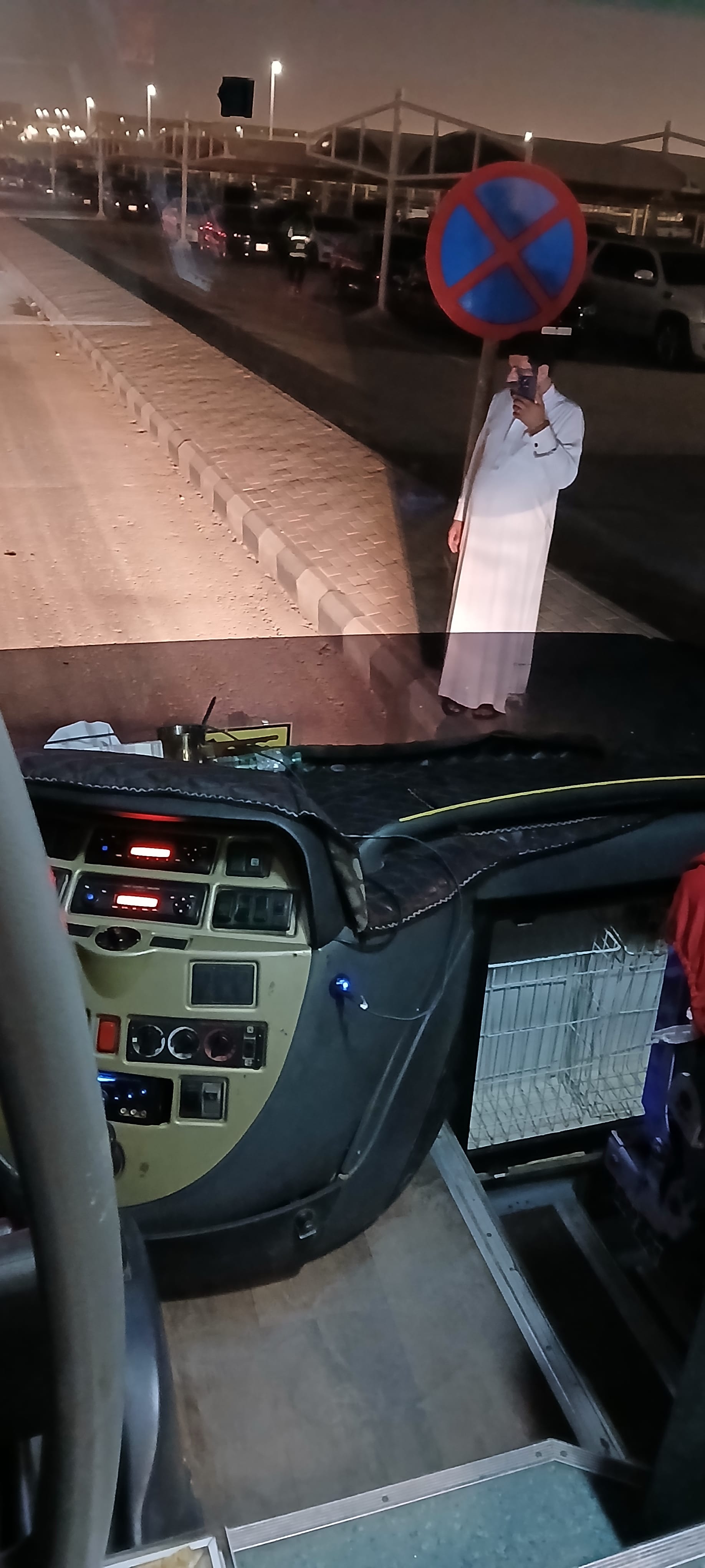 We started out with more caution and the night wore on. And came to nowhere we recognised. Looking here for the awning-covered carparks which were unlit when we passed them out the right window on the bus, and where, remember, there was that car ahead which turned right, going the wrong way into the carpark, closer to the stadium by miles than we could find a park, and remember how we doubted they would, either, find a park. . . We came to a well-lit parking area. Remember, our area was underlit. . . but then, look again at the photo, oh, yes, the photo, there are lollipop lights and the building opposite where we parked. That looks like it! It was part of the campus of King Saud University and a bus came along with Boys Campus as the destination. . . but that wasn't it. Then we got out from under our own rods mentally for a minute and resolved to ask, . . .where are the ushers when you need them?