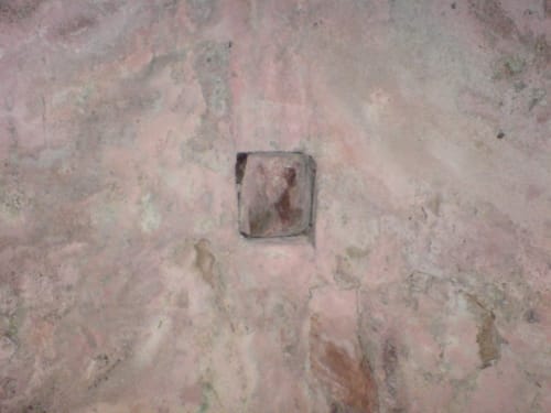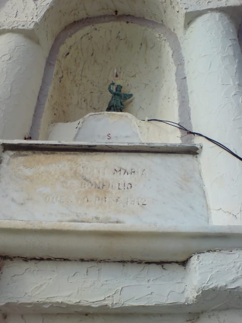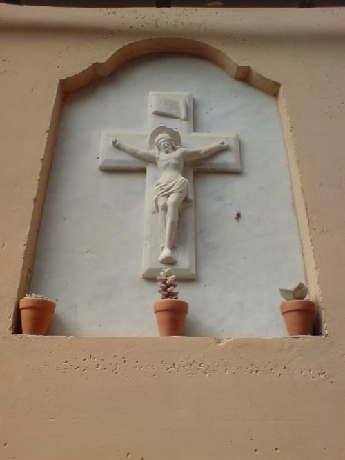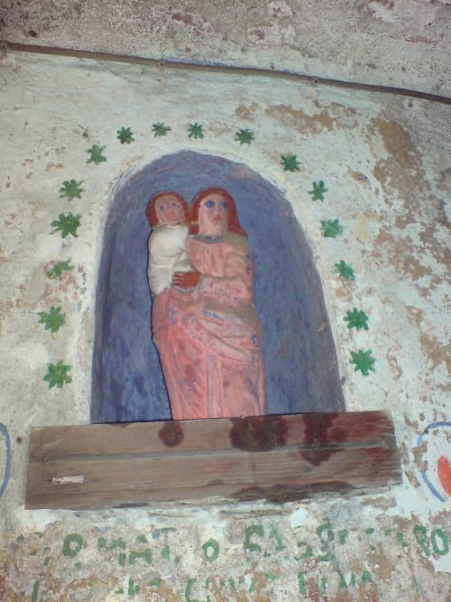 Half-way along there was the second of the failed enterprises we saw along the track, a series of semi-deserted buildings, through the arches of which we passed under the extreme blue eye shadowed gaze of the Madonna.