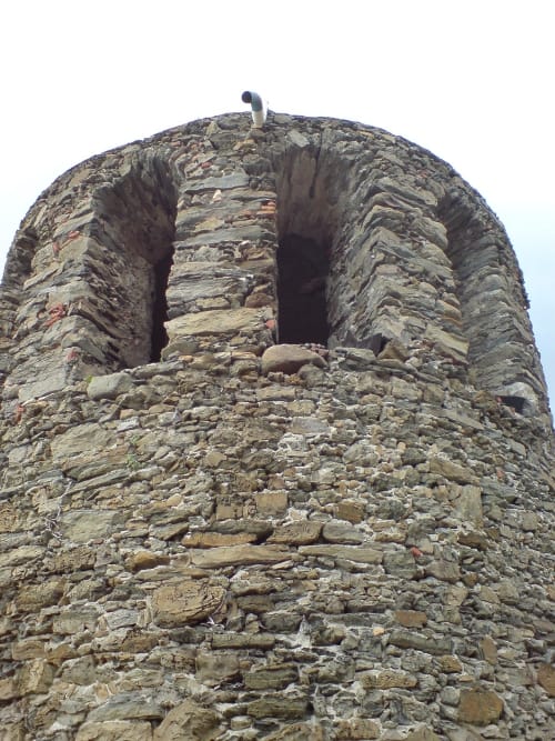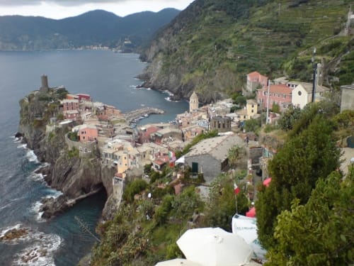 A section of descents by rough stairs, as lengthy as the preceding ascents, gave notice that we were getting near to Vernazza. Its fortifications were more obvious than the other two towns we’d seen. A circular stone tower loomed over the track and at its seaward end there appeared to be a castle.