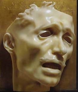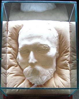 But it is not his. It is Nietzsche’s, a copy of the death mask allegedly at Weimar, in the keeping of Mrs. Elizabeth Forster-Nietzsche. (I would like to thank Undying Faces® for this information and commend the site on its innumerable mortuary delights.)