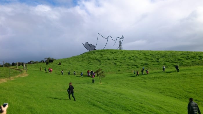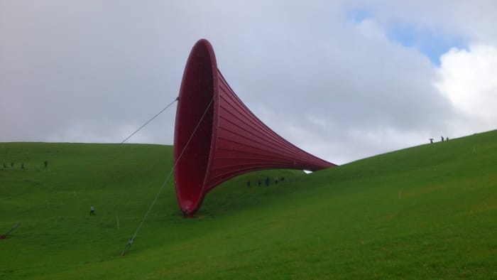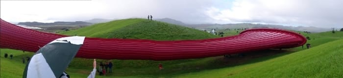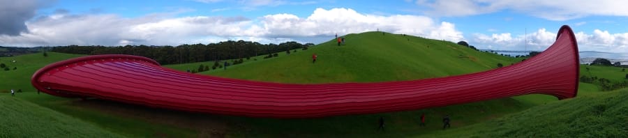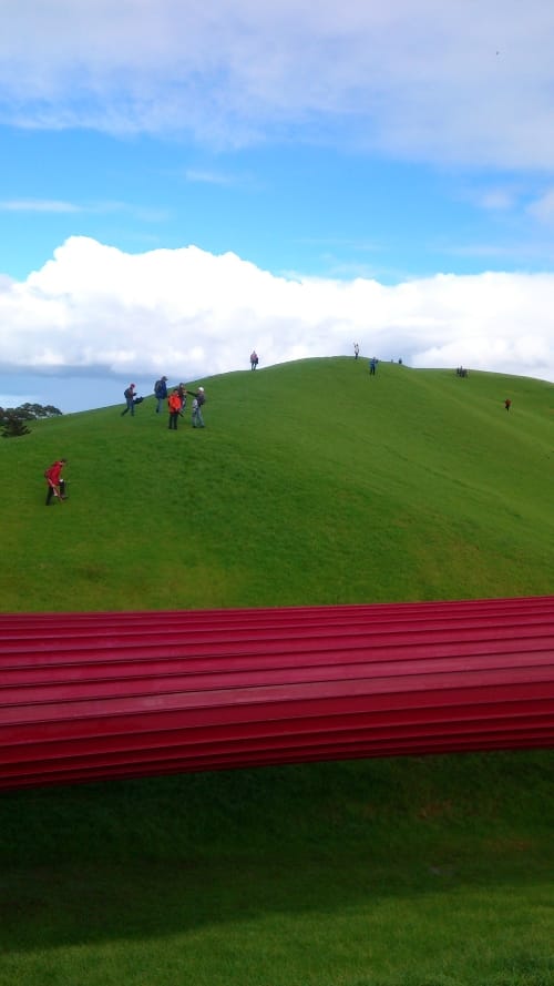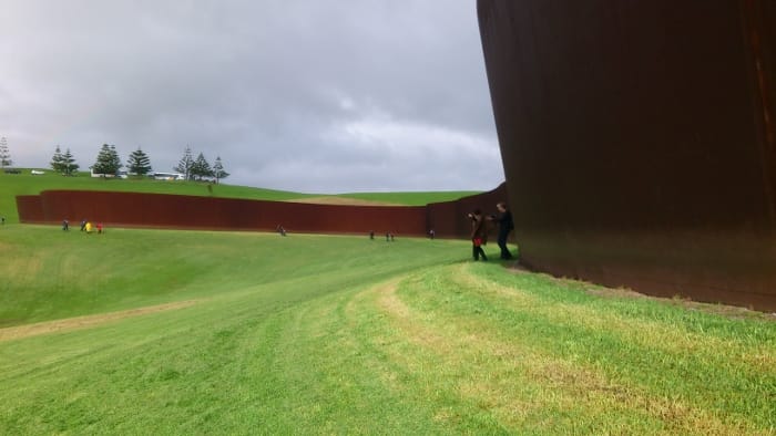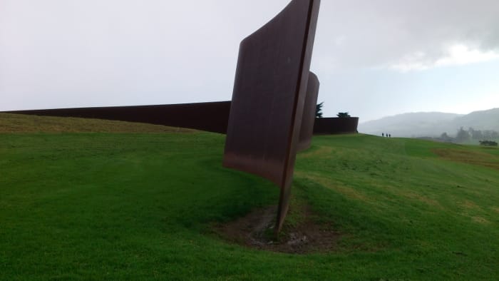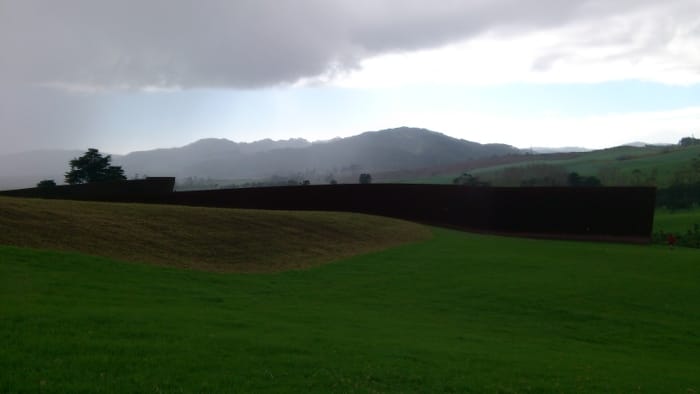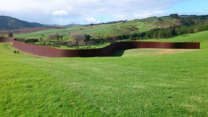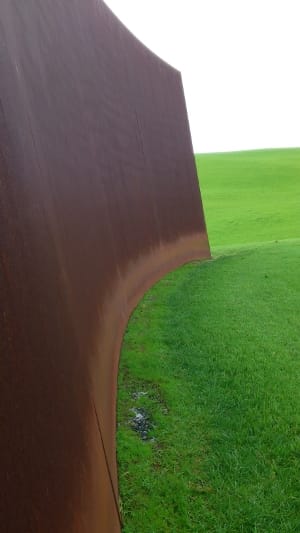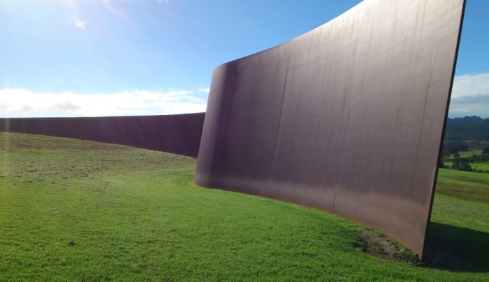 I love the Serra. Richard. Called Te Tuhirangi Contour no previous representative exposure prepared me for the feeling induced by bodily being near to 56 Corten steel plates 252m x 6m x 50mm. The angle of the wall is 11 degrees from the vertical, and the artist’s words have it that it “collects the volume of the land.” The mythology has it that when the work arrived, having been stacked in the hold of the ship, the plates had flattened, leaving no contour. The story continues that Serra had to replace it in its entirety.