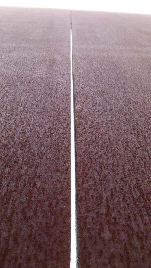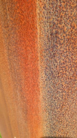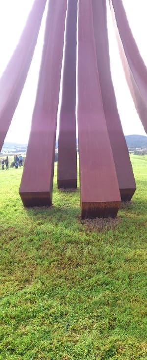 The feeling is rather than collection – however significant – a great calm. A similar calm to entering into an expansive interior, a Gothic cathedral. Edging one’s way along the work, the wall, I touched every Corten steel plate. Warm with a calm vitality. A human volume collected, not the volume of the land?