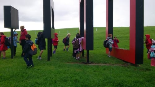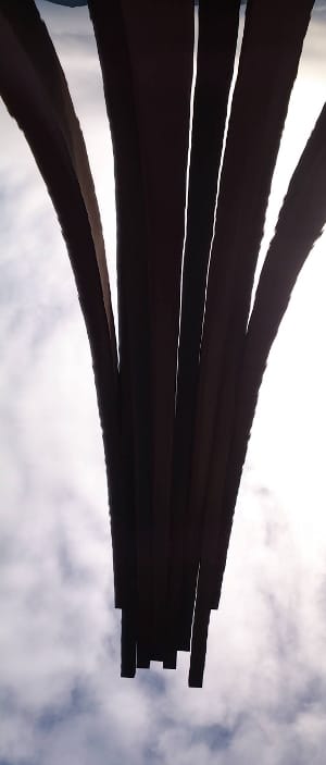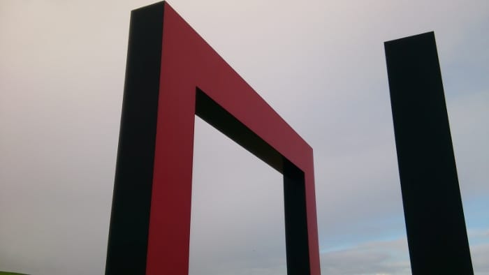 Neil Dawson’s Horizons someone called the Tintin and yes this for its purely graphic imposition on the landscape, an immortal’s fallen napkin, after finishing a meal of chromium ice cream, fits. But proximity gives away the device: painted pipe and painted mesh. Materials made clever. Which I suppose is Tintinesque too.