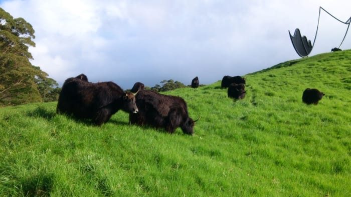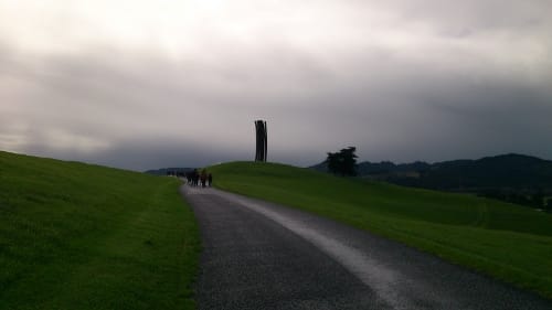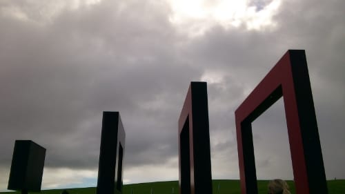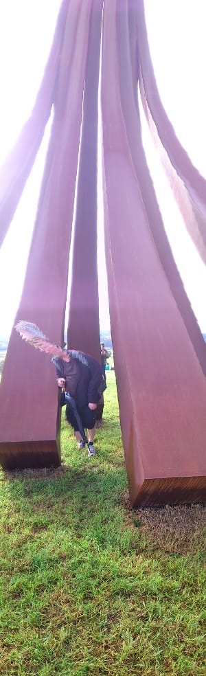 The biggest lawn I’ve seen outside Versailles. Much bigger than that. Mown. But with beasts too. First we saw sheep. Bernar Venet’s work sits on the hill. A collection of god’s dirty fingernail parings.