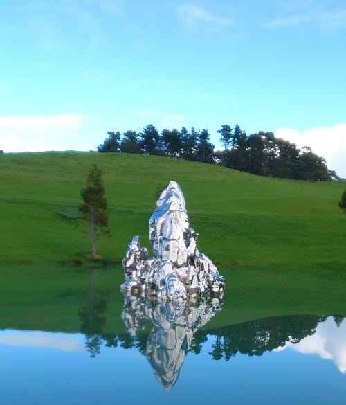 An enlargement of the Chinese miniature landscape, the brochure has Zhan Wang’s Floating Island of the Immortals serve as a landscape to look for an idealistic [sic] world of immortals. I think even immortals would slip from its shiny chrome-icecream surfaces.