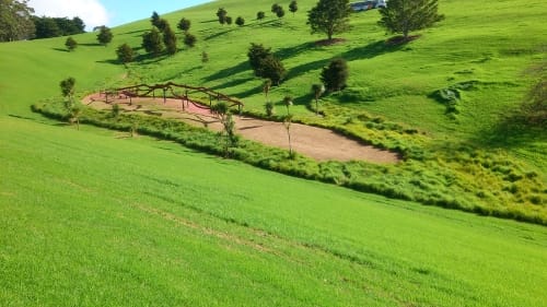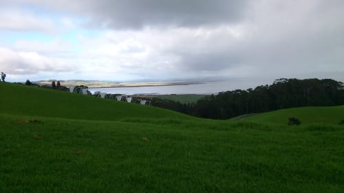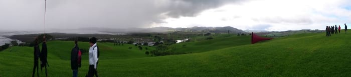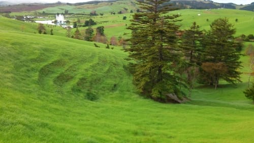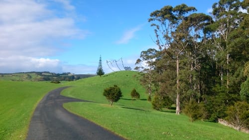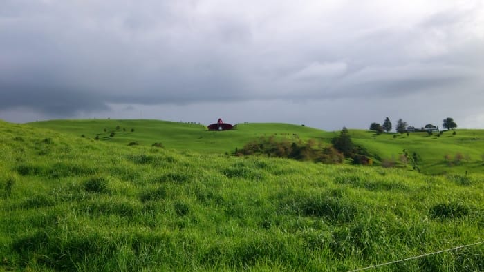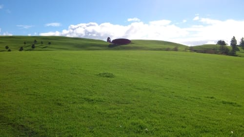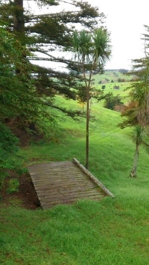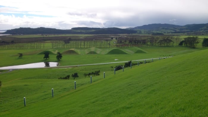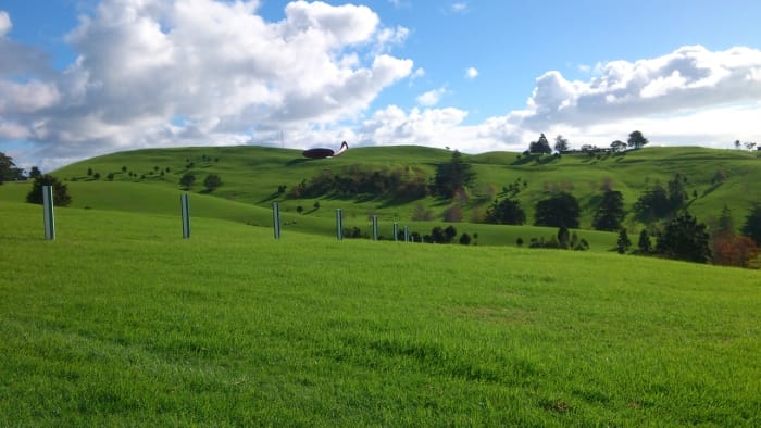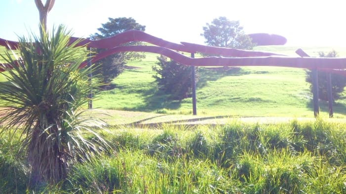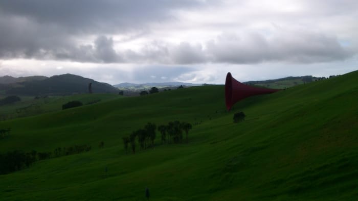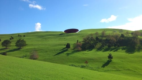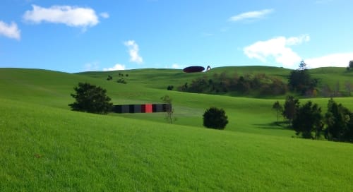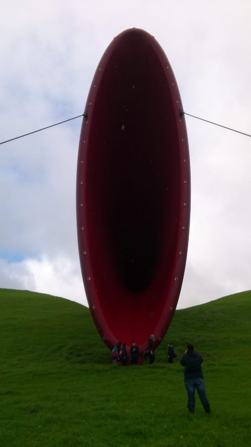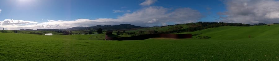 Introducing Dismemberment, Site 1, Anish Kapoor’s telluric diaphragm, and more a joining grommet or passage than a dismemberment, so I wonder what he meant. Dismemberment connects the Kaipara with the valley in which Gibbs is laconically and significantly situated. It nestles between mown mounds and suggests a sexual prosthetic for the earth.