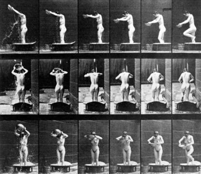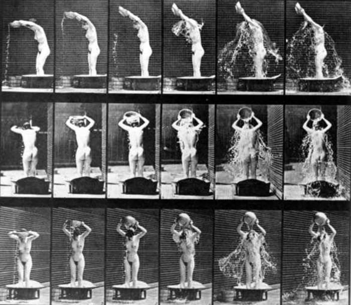 a gin that projected light, chopped into pieces to coincide with blinks, so that an impression of movement was achieved. Always the same movement, endless. The same woman on the same stairwell, taking the same three steps, continuously; a horse running to nowhere; a naked patriarch, swinging an axe. He says that the more one watches, the more their time becomes real, and the watcher’s time leaks out, becoming insignificant, the same as watching the water for too long.