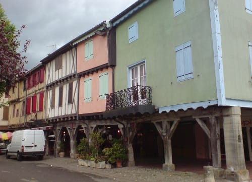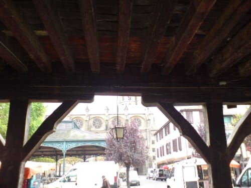 Mirepoix we stopped for lunch, les sandwichs. The town is famous for its medieval covered market. Within, there was a market being packed up by the normal ciggy-sucking hard merchant types, into once-white vans. Every cafe around the perimeter, however, full of ferals, hippy types, funky oldies. A whole new social scene out here. The trans-alpine?